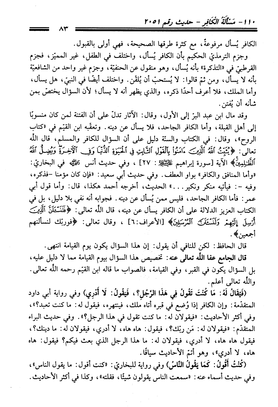 وقد مال ابن عبد البرّ إلى الأول، وقال: الآثار تدلّ على أن الفتنة لمن كان منسوبًا إلى أهل القبلة، وأما الكافر الجاحد، فلا يسأل عن دينه. وتعقّبه ابن القيّم في "كتاب الروح"، وقال: في الكتاب والسنّة دليل على أن السؤال للكافر والمسلم، قال اللَّه تعالى: {يُثَبِّتُ اللَّهُ الَّذِينَ آمَنُوا بِالْقَوْلِ الثَّابِتِ فِي الْحَيَاةِ الدُّنْيَا وَفِي الْآخِرَةِ وَيُضِلُّ اللَّهُ الظَّالِمِينَ} الآية [سورة إبراهيم - عليه السلام -: 27]، وفي حديث أنس - رضي اللَّه عنه - في البخاريّ: "وأما المنافق والكافر" بواو العطف. وفي حديث أبي سعيد: "فإن كان مؤمنا -فذكره، وفيه-: فيأتيه منكر ونكير ... " الحديث، أخرجه أحمد هكذا، قال: وأما قول أبي عمر: فأما الكافر الجاحد، فليس ممن يُسال عن دينه. فجوابه أنه نفي بلا دليل، بل في الكتاب العزيز الدلالة على أن الكافر يسأل عن دينه، قال اللَّه تعالى: {فَلَنَسْأَلَنَّ الَّذِينَ أُرْسِلَ إِلَيْهِمْ وَلَنَسْأَلَنَّ الْمُرْسَلِينَ} [الأعراف: 6]، وقال تعالى: {فَوَرَبِّكَ لَنَسْأَلَنَّهُمْ أَجْمَعِينَ}.