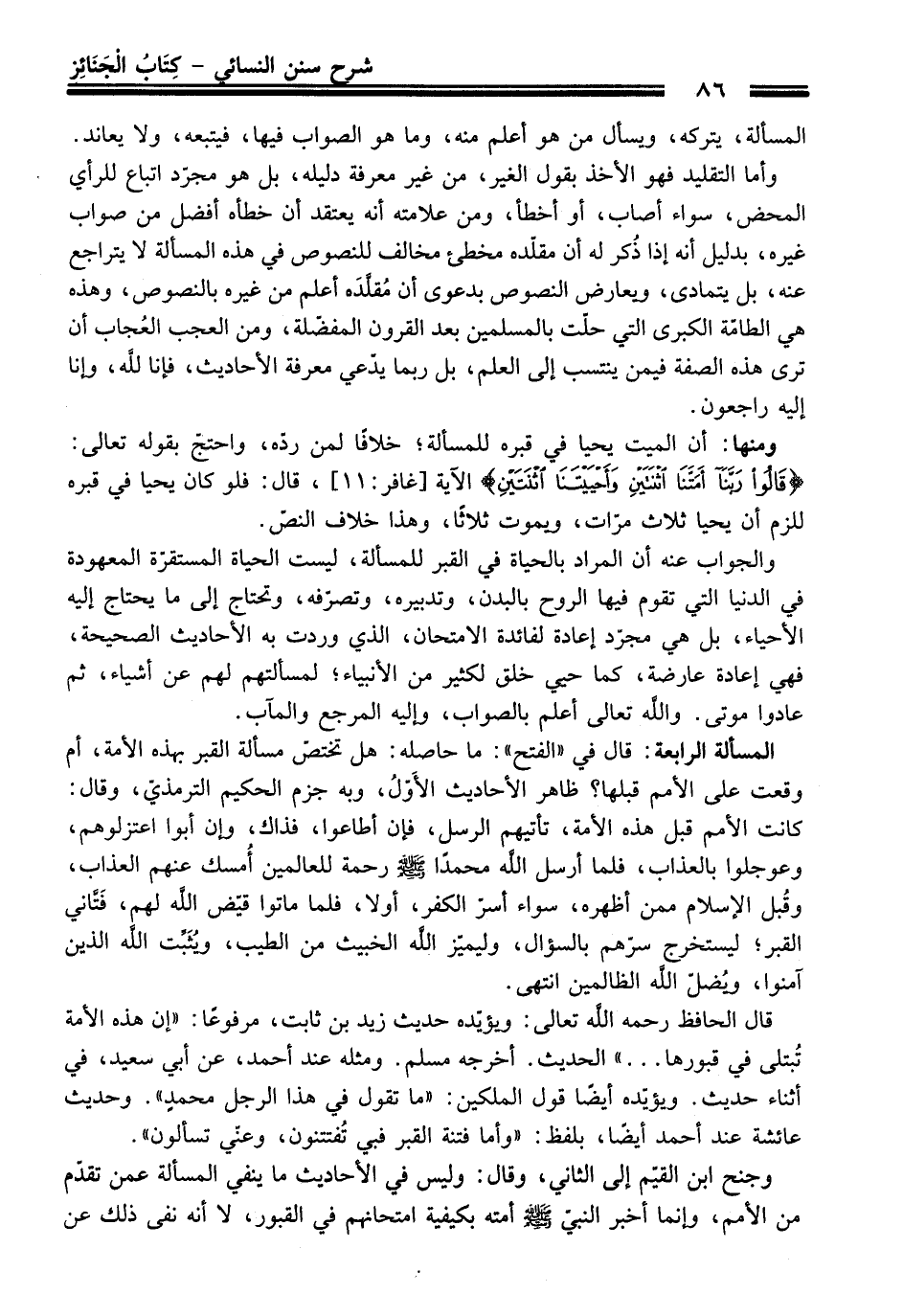 ومنها: أن الميت يحيا في قبره للمسألة؛ خلافًا لمن ردّه، واحتجّ بقوله تعالى: {قَالُوا رَبَّنَا أَمَتَّنَا اثْنَتَيْنِ وَأَحْيَيْتَنَا اثْنَتَيْنِ} الآية [غافر: 11]، قال: فلو كان يحيا في قبره للزم أن يحيا ثلاث مرّات، ويموت ثلاثًا، وهذا خلاف النصّ.