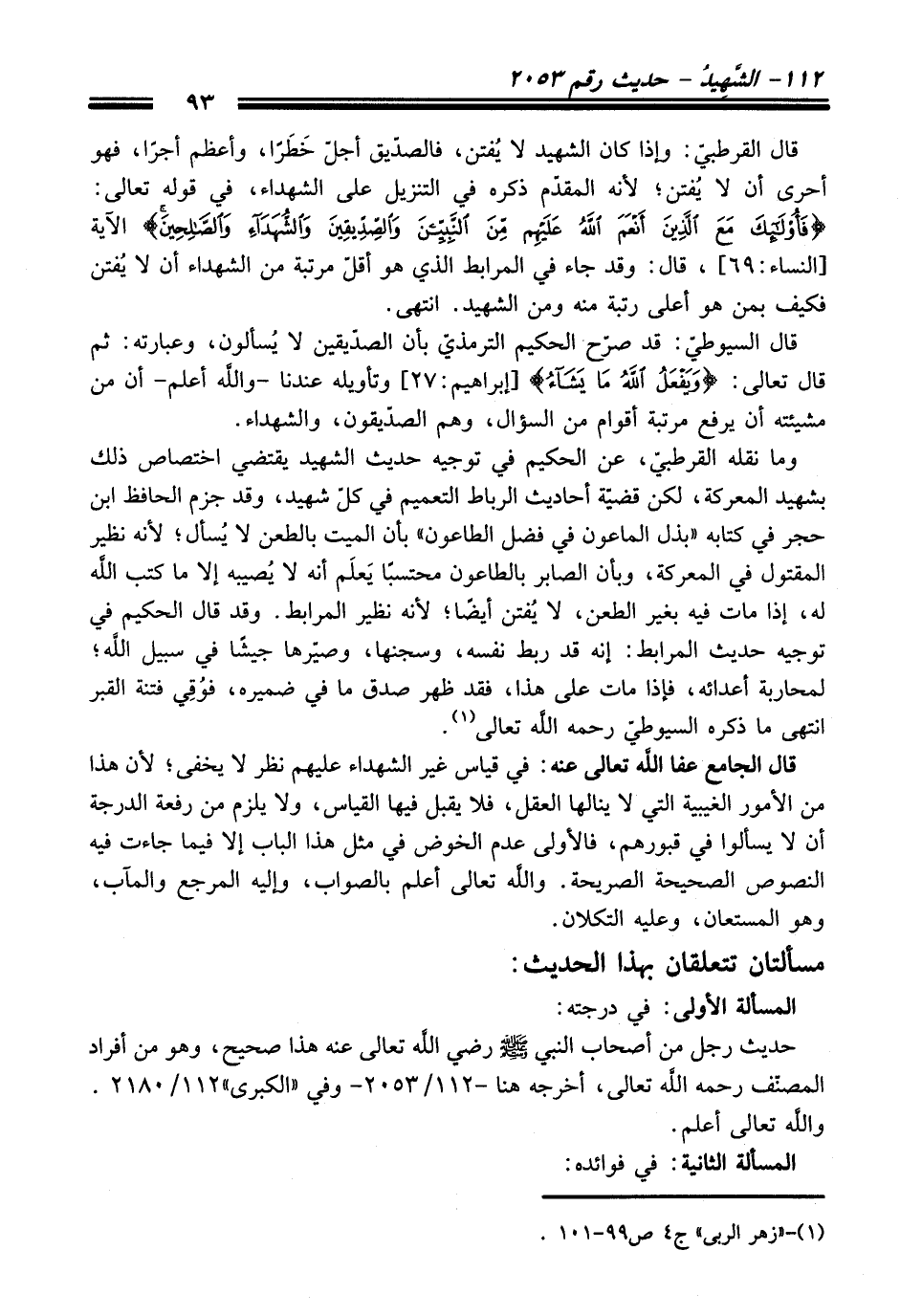 وما نقله القرطبيّ، عن الحكيم في توجيه حديث الشهيد يقتضي اختصاص ذلك بشهيد المعركة، لكن قضيّة أحاديث الرباط التعميم في كلّ شهيد، وقد جزم الحافظ ابن حجر في كتابه "بذل الماعون في فضل الطاعون" بأن الميت بالطعن لا يُسأل؛ لأنه نظير المقتول في المعركة، وبأن الصابر بالاعون محتسبًا يَعلَم أنه لا يُصيبه إلا ما كتب اللَّه له، إذا مات فيه بغير الطعن، لا يُفتن أيضًا؛ لأنه نظير المرابط. وقد قال الحكيم في توجيه حديث المرابط: إنه قد ربط نفسه، وسجنها، وصيّرها جيشًا في سبيل اللَّه؛ لمحاربة أعدائه، فإذا مات على هذا، فقد ظهر صدق ما في ضميره، فوُقِي فتنة القبر انتهى ما ذكره السيوطيّ -رَحِمَهُ اللَّهُ تَعَالَى- (¬1).