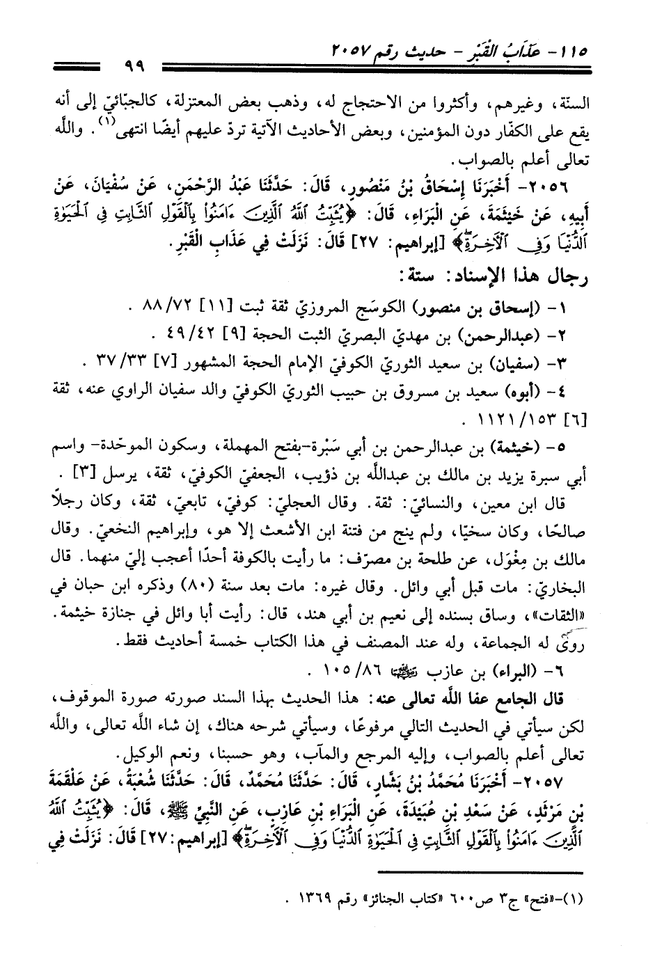 2056 - أَخْبَرَنَا إِسْحَاقُ بْنُ مَنْصُورٍ, قَالَ: حَدَّثَنَا عَبْدُ الرَّحْمَنِ, عَنْ سُفْيَانَ, عَنْ أَبِيهِ,, عَنْ خَيْثَمَةَ, عَنِ الْبَرَاءِ, قَالَ: {يُثَبِّتُ اللَّهُ الَّذِينَ آمَنُوا بِالْقَوْلِ الثَّابِتِ فِي الْحَيَاةِ الدُّنْيَا وَفِي الْآخِرَةِ} [إبراهيم: 27] قَالَ: نَزَلَتْ فِي عَذَابِ الْقَبْرِ.