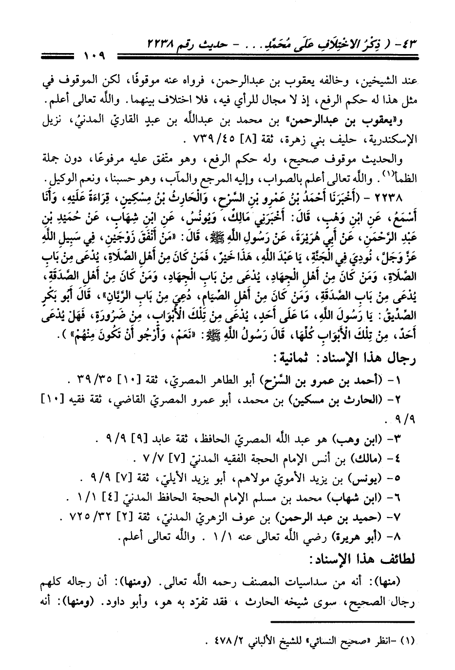 2238 - (أَخْبَرَنَا أَحْمَدُ بْنُ عَمْرِو بْنِ السَّرْحِ, وَالْحَارِثُ بْنُ مِسْكِينٍ, قِرَاءَةً عَلَيْهِ, وَأَنَا أَسْمَعُ عَنِ ابْنِ وَهْبٍ, قَالَ: أَخْبَرَنِي مَالِكٌ, وَيُونُسُ, عَنِ ابْنِ شِهَابٍ, عَنْ حُمَيْدِ بْنِ عَبْدِ الرَّحْمَنِ, عَنْ أَبِي هُرَيْرَةَ, عَنْ رَسُولِ اللَّهِ - صلى اللَّه عليه وسلم - قَالَ: «مَنْ أَنْفَقَ زَوْجَيْنِ, فِي سَبِيلِ اللَّهِ -عَزَّ وَجَلَّ-, نُودِيَ فِي الْجَنَّةِ, يَا عَبْدَ اللَّهِ, هَذَا خَيْرٌ, فَمَنْ كَانَ مِنْ أَهْلِ الصَّلاَةِ, يُدْعَى مِنْ بَابِ الصَّلاَةِ, وَمَنْ كَانَ مِنْ أَهْلِ الْجِهَادِ, يُدْعَى مِنْ بَابِ الْجِهَادِ, وَمَنْ كَانَ مِنْ أَهْلِ الصَّدَقَةِ, يُدْعَى مِنْ بَابِ الصَّدَقَةِ, وَمَنْ كَانَ مِنْ أَهْلِ الصِّيَامِ, دُعِيَ مِنْ بَابِ الرَّيَّانِ» , قَالَ أَبُو بَكْرٍ الصِّدِّيقُ: يَا رَسُولَ اللَّهِ, مَا عَلَى أَحَدٍ, يُدْعَى مِنْ تِلْكَ الأَبْوَابِ, مِنْ ضَرُورَةٍ, فَهَلْ يُدْعَى أَحَدٌ, مِنْ تِلْكَ الأَبْوَابِ كُلِّهَا, قَالَ رَسُولُ اللَّهِ - صلى اللَّه عليه وسلم -: «نَعَمْ وَأَرْجُو أَنْ تَكُونَ مِنْهُمْ»).