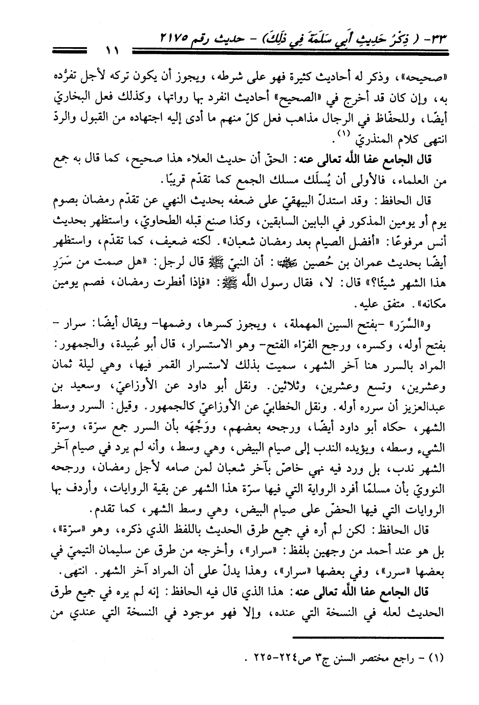 قال الحافظ: وقد استدلّ البيهقيّ على ضعفه بحديث النهي عن تقدّم رمضان بصوم يوم أو يومين المذكور في البابين السابقين، وكذا صنع قبله الطحاويّ، واستظهر بحديث أنس مرفوعًا: "أفضل الصيام بعد رمضان شعبان". لكنه ضعيف، كما تقدّم، واستظهر أيضًا بحديث عمران بن حُصين - رضي اللَّه عنهما -: أن النبيّ - صلى اللَّه عليه وسلم - قال لرجل: "هل صمت من سَرَرِ هذا الشهر شيئًا؟ " قال: لا، فقال رسول اللَّه - صلى اللَّه عليه وسلم -: "فإذا أفطرت رمضان، فصم يومين مكانه". متفق عليه.