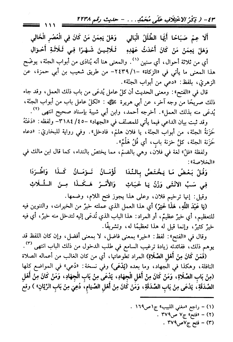 أي من ثلاثة أحوال، أي سنين (¬1). والمعنى هنا أنه يُنادَى من أبواب الجنّة، يوضح هذا المعنى ما يأتي في "الزكاة"- 1/ 2439 - من طريق شعيب بن أبي حمزة، عن الزهريّ، بلفظ: "دعي من أبواب الجنّة".