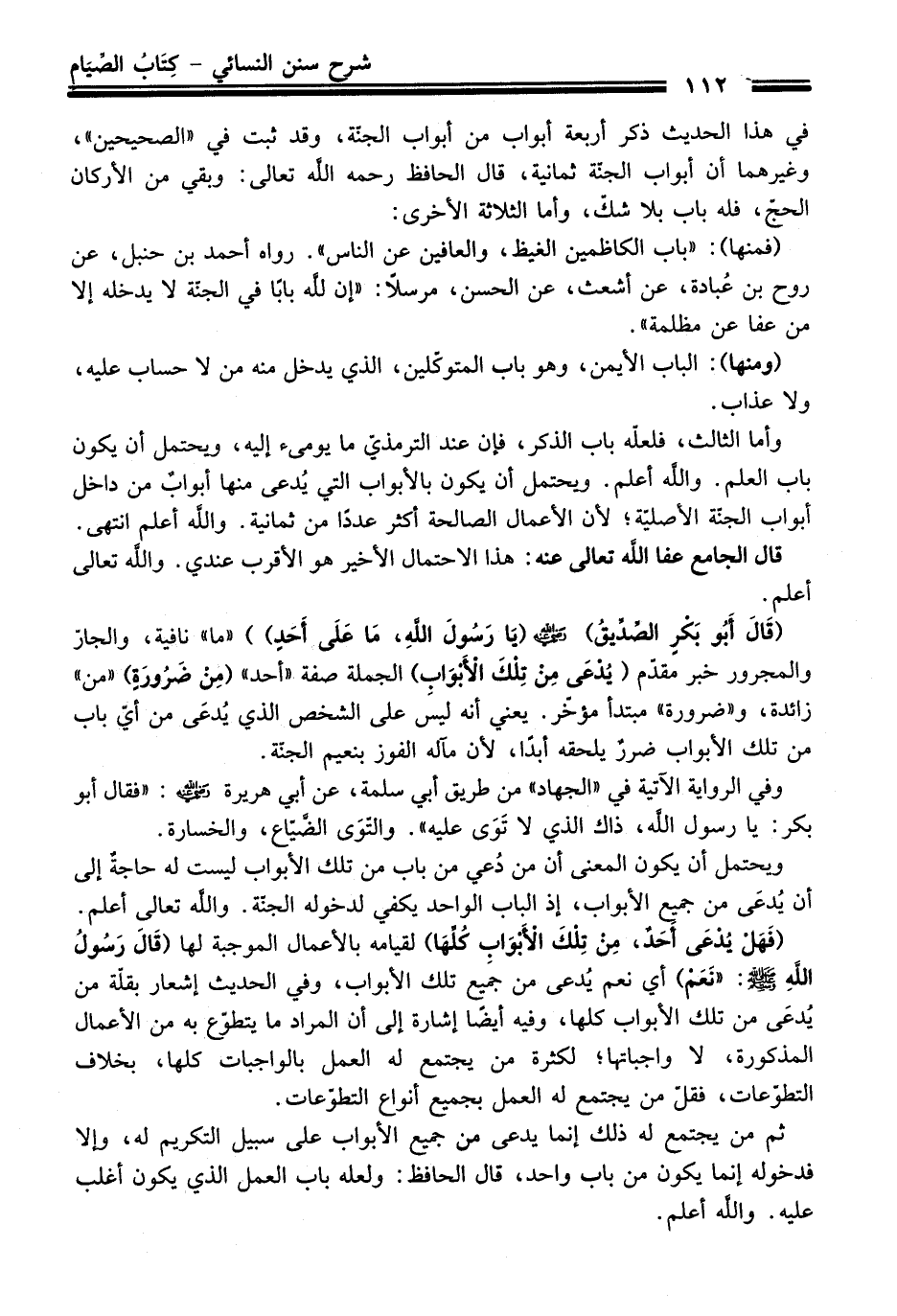 ويحتمل أن يكون المعنى أن من دُعي من باب من تلك الأبواب ليست له حاجةٌ إلى أن يُدعَى من جميِع الأبواب، إذ الباب الواحد يكفي لدخوله الجنّة. واللَّه تعالى أعلم.