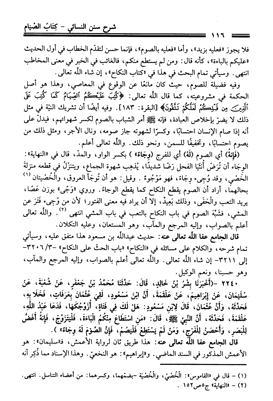 2240 - (أَخْبَرَنَا بِشْرُ بْنُ خَالِدٍ, قَالَ: حَدَّثَنَا مُحَمَّدُ بْنُ جَعْفَرٍ, عَنْ شُعْبَةَ, عَنْ سُلَيْمَانَ, عَنْ إِبْرَاهِيمَ, عَنْ عَلْقَمَةَ, أَنَّ ابْنَ مَسْعُودٍ, لَقِيَ عُثْمَانَ بِعَرَفَاتٍ, فَخَلاَ بِهِ, فَحَدَّثَهُ, وَأَنَّ عُثْمَانَ, قَالَ لاِبْنِ مَسْعُودٍ: هَلْ لَكَ فِي فَتَاةٍ, أُزَوِّجُكَهَا, فَدَعَا عَبْدُ اللَّهِ, عَلْقَمَةَ, فَحَدَّثَهُ, أَنَّ النَّبِيَّ - صلى اللَّه عليه وسلم -, قَالَ: «مَنِ اسْتَطَاعَ مِنْكُمُ الْبَاءَةَ, فَلْيَتَزَوَّجْ, فَإِنَّهُ أَغَضُّ لِلْبَصَرِ, وَأَحْصَنُ لِلْفَرْجِ, وَمَنْ لَمْ يَسْتَطِعْ فَلْيَصُمْ, فَإِنَّ الصَّوْمَ لَهُ وِجَاءٌ»).