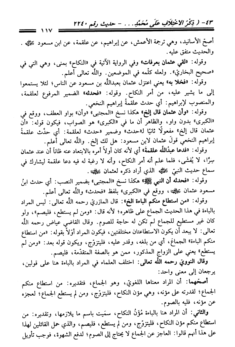 وقوله: "من استطاع منكم الباءة الخ": قال المازريّ -رحمه اللَّه تعالى-: ليس المراد بالباءة في هذا الحديث الجماع على ظاهره؛ لأنه قال: "ومن لم يستطع، فليصم"،ولو كان غير مستطيع للجماع لم تكن له حاجة للصوم. وقال القاضي عياض -رَحِمَهُ اللَّهُ- تعالى: لا يبعد أن يكون الاستطاعتان مختلفتين، فيكون المراد أوّلاً بقوله: "من استطاع منكم الباءة" الجماعَ، أي من بلغه، وقدر عليه، فليتزوّج، ويكون قوله بعد: "ومن لم يستطع" يعني على الزواج المذكور، ممن هو بالصفة المتقدّمة، فليصم.