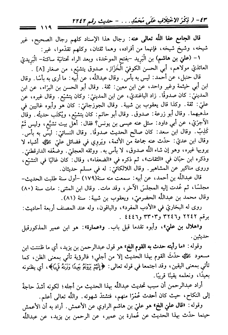 1 - (عليّ بن هاشم) بن الْبَرِيد -بفتح الموحّدة، وبعد الراء تحتانيّة ساكنة- الْبَرِيديّ العائذّي مولاهم، أبي الحسن الكوفيّ الْخَزّاز، صدوق يتشيّع، من صغار [8].