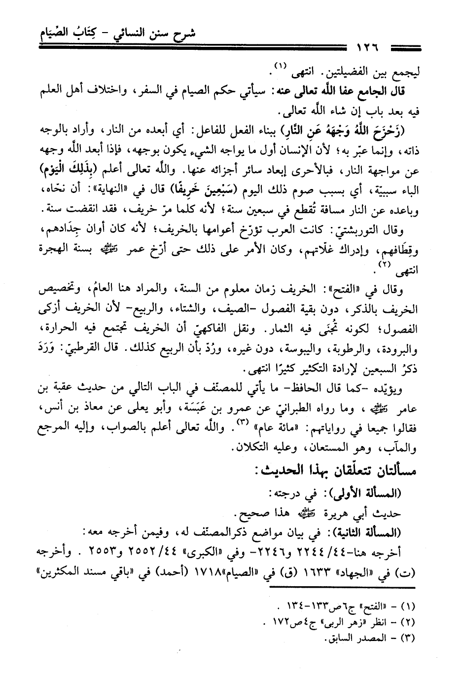 (زَحْزَحَ اللَّه وَجْهَهُ عَنِ النَّارِ) ببناء الفعل للفاعل: أي أبعده من النار، وأراد بالوجه ذاته، وإنما عبّر به؛ لأن الإنسان أول ما يواجه الشيء يكون بوجهه، فإذا أبعد اللَّه وجهه عن مواجهة النار، فبالأحرى إبعاد سائر أجزائه عنها. واللَّه تعالى أعلم (بِذَلِكَ الْيَوْم) الباء سببيّة، أي بسبب صوم ذلك اليوم (سَبْعِينَ خَرِيفًا) قال في "النهاية": أن نحّاه، وباعده عن النار مسافة تُقطع في سبعين سنة؛ لأنه كلما مرّ خريف، فقد انقضت سنة.