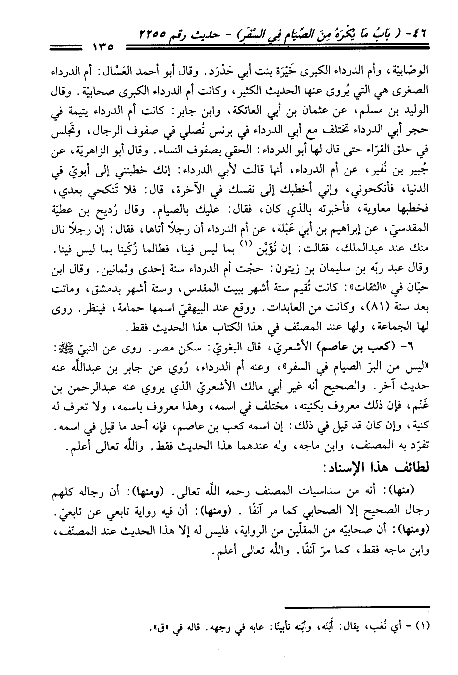 الوصّابيّة، وأم الدرداء الكبرى خَيْرَة بنت أبي حَدْرَد. وقال أبو أحمد العَسَّال: أم الدرداء الصغرى هي التي يُروى عنها الحديث الكثير، وكانت أم الدرداء الكبرى صحابيّة. وقال الوليد بن مسلم، عن عثمان بن أبي العاتكة، وابن جابر: كانت أم الدرداء يتيمة في حجر أبي الدرداء تختلف مع أبي الدرداء في برنس تُصلي في صفوف الرجال، وتَجلس في حلق القرّاء حتى قال لها أبو الدرداء: الحقي بصفوف النساء. وقال أبو الزاهريّة، عن جُبير بن نُفير، عن أم الدرداء، أنها قالت لأبي الدرداء: إنك خطبتني إلى أبويّ في الدنيا، فأنكحوني، وإني أخطبك إلى نفسك في الآخرة، قال: فلا تَنكحي بعدي، فخطبها معاوية، فأخبرته بالذي كان، فقال: عليك بالصيام. وقال رُديح بن عطيّة المقدسيّ، عن إبراهيم بن أبي عَبْلة، عن أم الدرداء أن رجلاً أتاها، فقال: إن رجلاً نال منك عند عبد الملك، فقالت: إن نُؤَبَّن (¬1) بما ليس فينا، فطالما زُكّينا بما ليس فينا. وقال عبد ربّه بن سليمان بن زيتون: حجت أم الدرداء سنة إحدى وثمانين. وقال ابن حبّان في "الثقات": كانت تُقيم ستة أشهر ببيت المقدس، وستة أشهر بدمشق، وماتت بعد سنة (81)، وكانت من العابدات. ووقع عند البيهقيّ اسمها حمامة، فينظر. روى لها الجماعة، ولها عند المصنّف في هذا الكتاب هذا الحديث فقط.