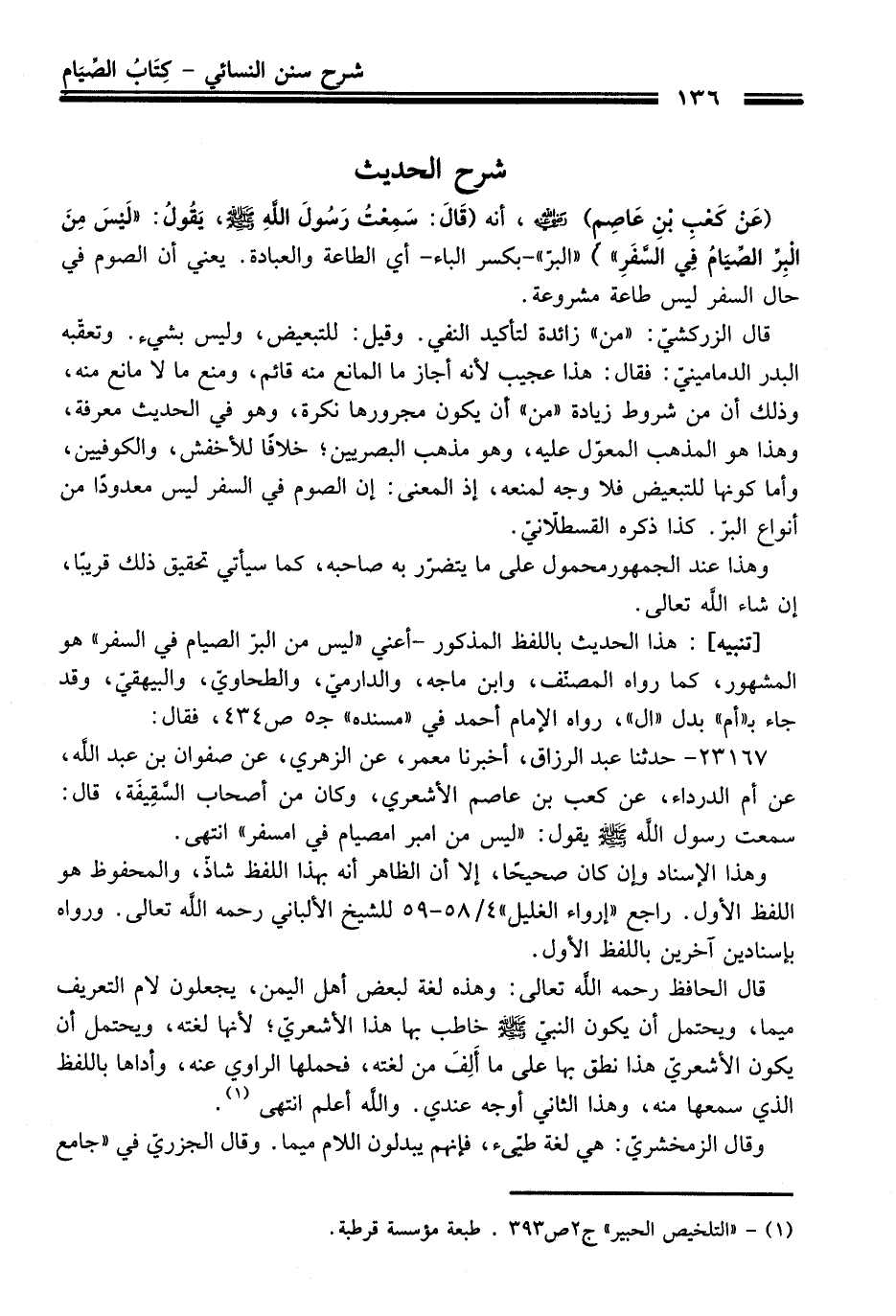 [تنبيه]: هذا الحديث باللفظ المذكور -أعني "ليس من البرّ الصيام في السفر" هو المشهور، كما رواه المصنّف، وابن ماجه، والدارميّ، والطحاويّ، والبيهقيّ، وقد جاء بـ"أم" بدل "ال"، رواه الإمام أحمد في "مسنده" جـ5 ص 434، فقال: