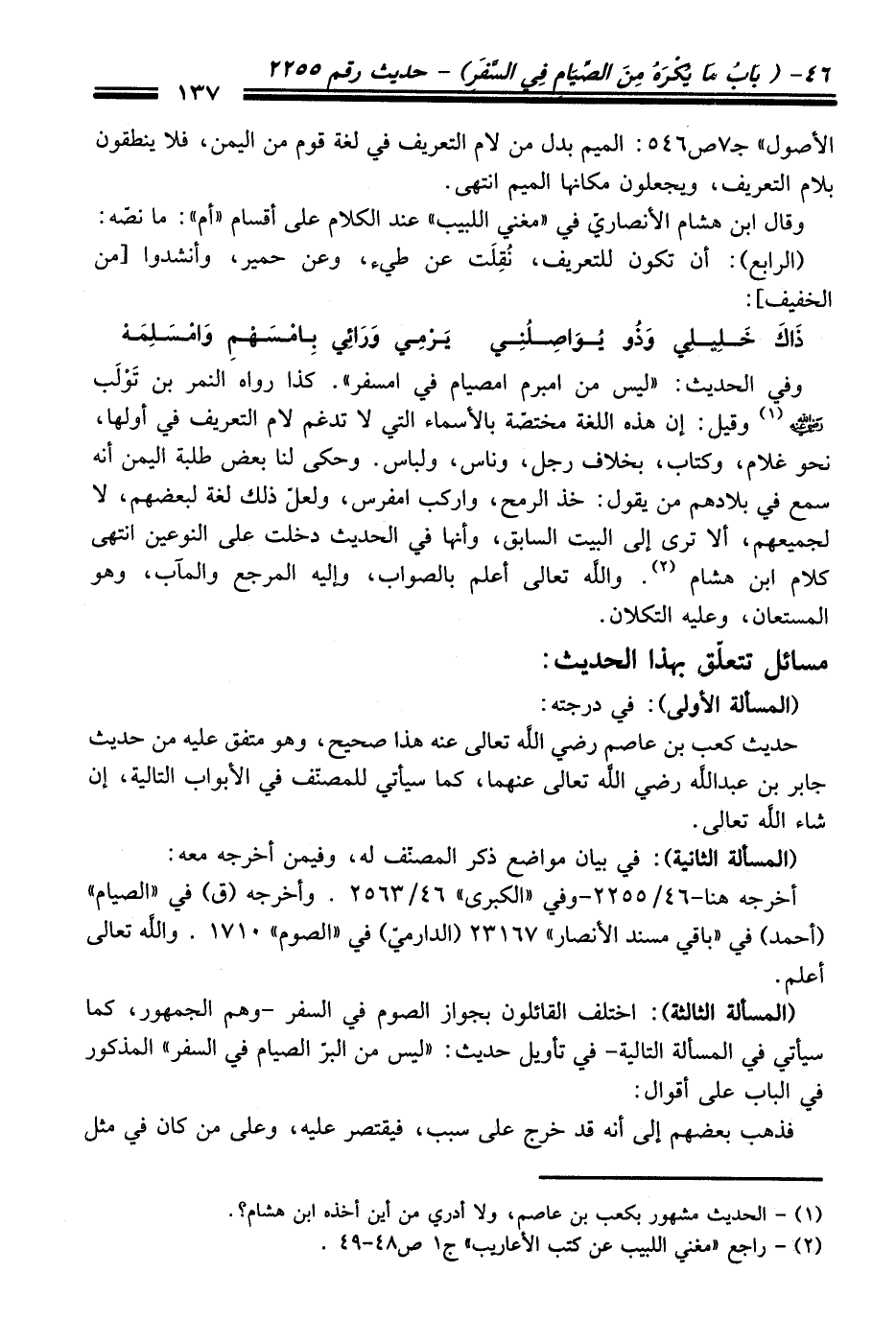 وفي الحديث: "ليس من امبرم امصيام في امسفر". كذا رواه النمر بن تَوْلَب - رضي اللَّه عنه - (¬1) وقيل: إن هذه اللغة مختصّة بالأسماء التي لا تدغم لام التعريف في أولها، نحو غلام، وكتاب، بخلاف رجل، وناس، ولباس. وحكى لنا بعض طلبة اليمن أنه سمع في بلادهم من يقول: خذ الرمح، واركب امفرس، ولعلّ ذلك لغة لبعضهم، لا لجميعهم، ألا ترى إلى البيت السابق، وأنها في الحديث دخلت على النوعين انتهى كلام ابن هشام (¬2). واللَّه تعالى أعلم بالصواب، وإليه المرجع والمآب، وهو المستعان، وعليه التكلان.