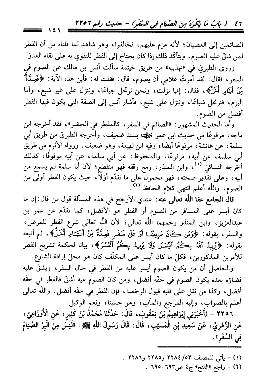 وروى الطبريّ في "تهذيبه" من طريق خيثمة سألت أنس بن مالك عن الصوم في السفر، فقال: لقد أمرتُ غلامي أن يصوم، قال: فقلت له: فأين هذه الآية: {فَعِدَّةٌ مِنْ أَيَّامٍ أُخَرَ}، فقال: إنها نزلت، ونحن نرتحل جياعًا، وننزل على غير شبع، وأما اليوم، فنرتحل شباعًا، وننزل على شبع، فأشار أنس إلى الصفة التي يكون فيها الفطر أفضل من الصوم.