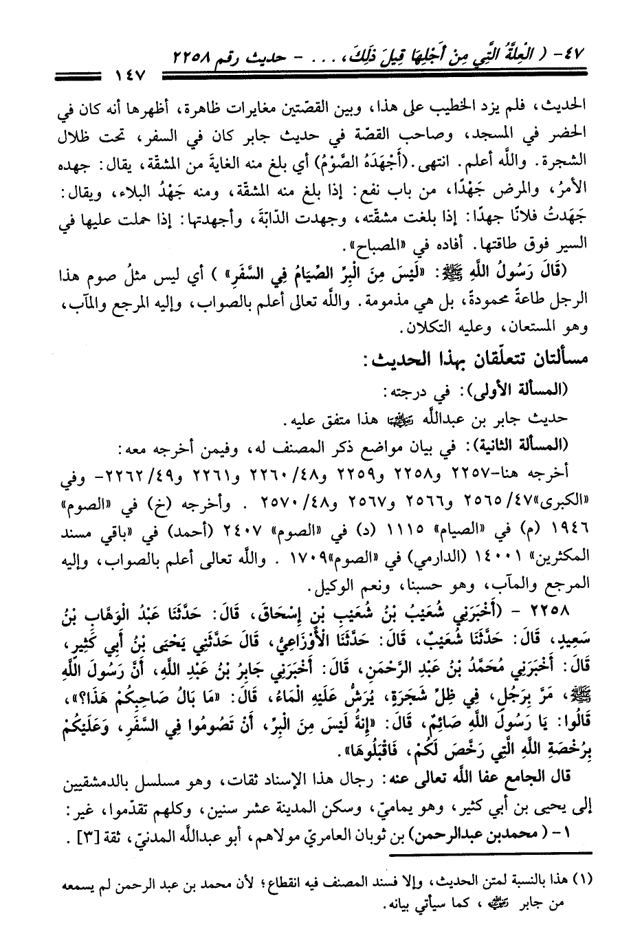 2258 - (أَخْبَرَنِي شُعَيْبُ بْنُ شُعَيْبِ بْنِ إِسْحَاقَ, قَالَ: حَدَّثَنَا عَبْدُ الْوَهَّابِ بْنُ سَعِيدٍ, قَالَ: حَدَّثَنَا شُعَيْبٌ, قَالَ: حَدَّثَنَا الأَوْزَاعِيُّ, قَالَ: حَدَّثَنِي يَحْيَى بْنُ أَبِي كَثِيرٍ, قَالَ: أَخْبَرَنِي مُحَمَّدُ بْنُ عَبْدِ الرَّحْمَنِ, قَالَ: أَخْبَرَنِي جَابِرُ بْنُ عَبْدِ اللَّهِ, أَنَّ رَسُولَ اللَّهِ - صلى اللَّه عليه وسلم -, مَرَّ بِرَجُلٍ, فِي ظِلِّ شَجَرَةٍ, يُرَشُّ عَلَيْهِ الْمَاءُ, قَالَ: «مَا بَالُ صَاحِبِكُمْ هَذَا؟» , قَالُوا: يَا رَسُولَ اللَّهِ صَائِمٌ, قَالَ: «إِنَّهُ لَيْسَ مِنَ الْبِرِّ, أَنْ تَصُومُوا فِي السَّفَرِ, وَعَلَيْكُمْ بِرُخْصَةِ اللَّهِ الَّتِي رَخَّصَ لَكُمْ, فَاقْبَلُوهَا»).