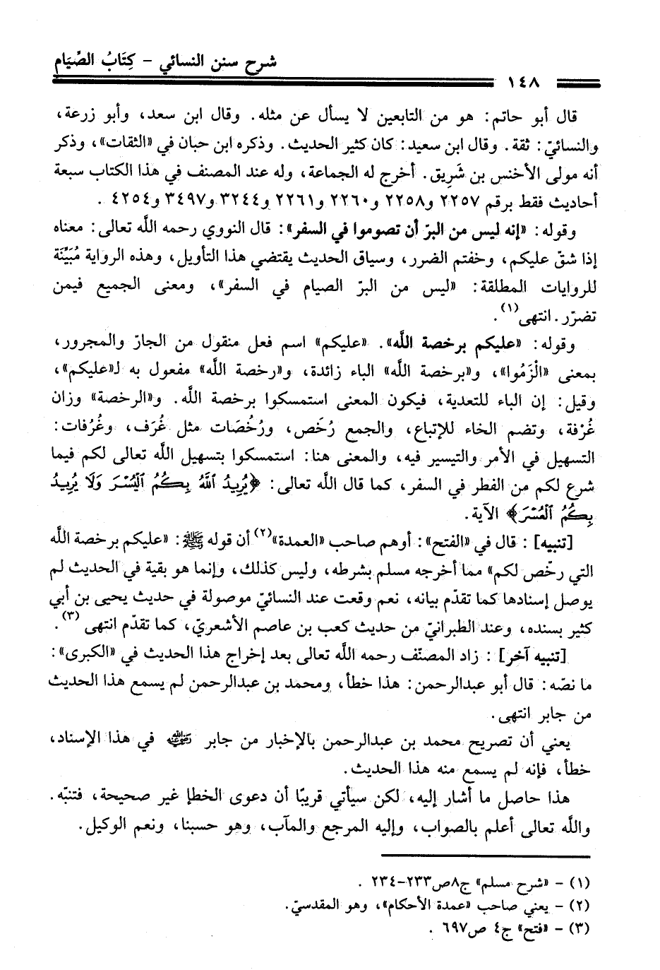 [تنبيه]: قال في "الفتح": أوهم صاحب "العمدة" (¬2) أن قوله - صلى اللَّه عليه وسلم -: "عليكم برخصة اللَّه التي رخّص لكم" مما أخرجه مسلم بشرطه، وليس كذلك، وإنما هو بقية في الحديث لم يوصل إسنادها كما تقدّم بيانه، نعم وقعت عند النسائيّ موصولة في حديث يحيى بن أبي كثير بسنده، وعند الطبرانيّ من حديث كعب بن عاصم الأشعريّ، كما تقدّم انتهى (¬3).