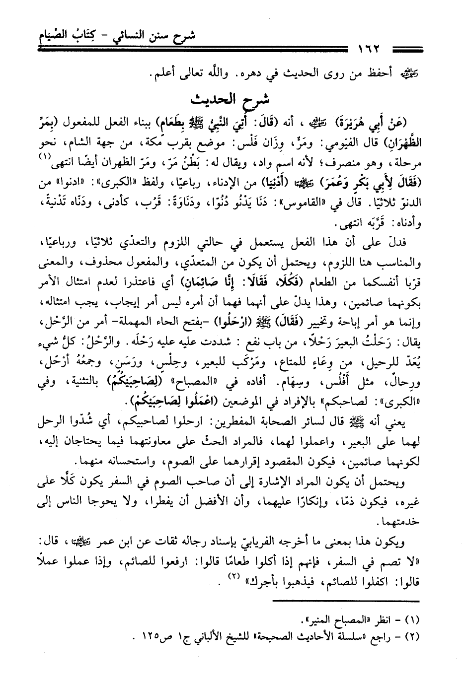 فدلّ على أن هذا الفعل يستعمل في حالتي اللزوم والتعدّي ثلاثيّا، ورباعيّا، والمناسب هنا اللزوم، ويحتمل أن يكون من المتعدّي، والمفعول محذوف، والمعنى قرّبا أنفسكما من الطعام (فَكُلَا، فَقَالَا: إِنَّا صَائِمَانِ) أي فاعتذرا لعدم امتثال الأمر بكونهما صائمين، وهذا يدلّ على أنهما فهما أن أمره ليس أمر إيجاب، يجب امتثاله، وإنما هو أمر إباحة وتخيير (فَقَالَ) - صلى اللَّه عليه وسلم - (ارْحَلُوا) -بفتح الحاء المهملة- أمر من الرَّحْل، يقال: رَحَلْتُ البعيرَ رَحْلاً، من باب نفع: شددت عليه عليه رَحْلَه. والرَّحْلُ: كلُّ شيء يُعَدّ للرحيل، من وِعَاءٍ للمتاع، ومَرْكَب للبعير، وحِلْسٍ، ورَسَنٍ، وجمعُهُ أرْحَل، ورِحالٌ، مثل أَفْلُس، وسِهَام. أفاده في "المصباح" (لِصَاحِبَيْكُمُ) بالتثنية، وفي "الكبرى": لصاحبكم" بالإفراد في الموضعين (اعْمَلُوا لِصَاحِبَيكُمْ).