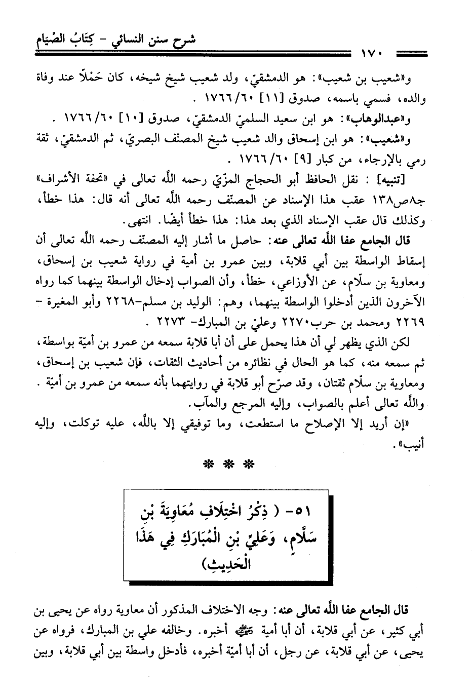 قال الجامع - عفا اللَّه تعالى عنه -: حاصل ما أشار إليه المصنّف -رحمه اللَّه تعالى- أن إسقاط الواسطة بين أبي قلابة، وبين عمرو بن أمية في رواية شعيب بن إسحاق، ومعاوية بن سلاّم، عن الأوزاعي، خطأ، وأن الصواب إدخال الواسطة بينهما كما رواه الآخرون الذين أدخلوا الواسطة بينهما، وهم: الوليد بن مسلم-2268 وأبو المغيرة- 2269 ومحمد بن حرب 2270 وعليّ بن المبارك- 2273.