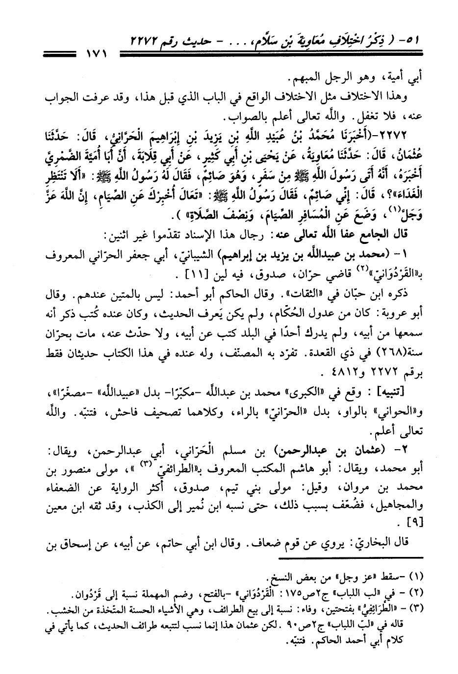 2272 - (أَخْبَرَنَا مُحَمَّدُ بْنُ عُبَيْدِ اللَّهِ بْنِ يَزِيدَ بْنِ إِبْرَاهِيمَ الْحَرَّانِيُّ, قَالَ: حَدَّثَنَا عُثْمَانُ, قَالَ: حَدَّثَنَا مُعَاوِيَةُ, عَنْ يَحْيَى بْنِ أَبِي كَثِيرٍ, عَنْ أَبِي قِلاَبَةَ, أَنَّ أَبَا أُمَيَّةَ الضَّمْرِيَّ أَخْبَرَهُ, أَنَّهُ أَتَى رَسُولَ اللَّهِ - صلى اللَّه عليه وسلم - مِنْ سَفَرٍ, وَهُوَ صَائِمٌ, فَقَالَ لَهُ رَسُولُ اللَّهِ - صلى اللَّه عليه وسلم -: «أَلاَ تَنْتَظِرِ الْغَدَاءَ؟» , قَالَ: إِنِّي صَائِمٌ, فَقَالَ رَسُولُ اللَّهِ - صلى اللَّه عليه وسلم -: «تَعَالَ أُخْبِرْكَ عَنِ الصِّيَامِ, إِنَّ اللَّهَ -عَزَّ وَجَلَّ- (¬1) , وَضَعَ عَنِ الْمُسَافِرِ الصِّيَامَ, وَنِصْفَ الصَّلاَةِ»).