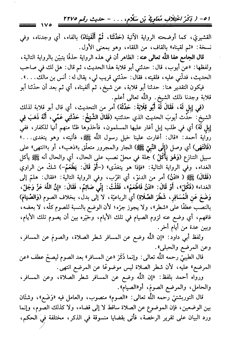 (فِي إِبِلٍ لَهُ، فَقَالَ: لَهُ أَبُو قِلَابَةَ: حَدِّثْهُ) أمر من التحديث، أي قال أبو قلابة لذلك الشيخ: حدّث أيوبَ الحديث الذي حدثتنيه (فَقَالَ: الشَّيْخُ: حَدَّثَنِي عَمِّي، أنَّهُ ذَهَبَ فِي إِبِلٍ لَهُ) أي في طلب إبل أغار عليها المسلمون، فأخذوها ظنّا منهم أنها للكفار، ففي رواية أحمد: "قال: أغارت علينا خيل رسول اللَّه - صلى اللَّه عليه وسلم -، فأتيته، وهو يتغدى ... " (فَانْتَهَى) أي وصل (إِلَى النَّبِيِّ - صلى اللَّه عليه وسلم -) الجار والمجرور متعلّق بـ"ذهب"، أو بـ"انتهى" على سبيل التنازع (وَهُوَ يَأْكُلُ) جملة في محلّ نصب على الحال، أي والحال أنه - صلى اللَّه عليه وسلم - يأكل الغداء، وفي الرواية التالية: "فهذا هو يتغذى" (-أَوْ قَالَ: يَطْعَمُ-) شكّ من الراوي (فَقَالَ) - صلى اللَّه عليه وسلم - ("ادْنُ) أمر من الدنوّ، أي اقرُب، وفي الرواية التالية: "فقال: هلمّ إلى الغداء" (فَكُلْ"، أَوْ قَالَ: "ادْنُ فَاطْعَمْ"، فَقُلْتُ: إِنِّي صَائمٌ، فَقَالَ: "إِنَّ اللَّهَ -عَزَّ وَجَلَّ-، وَضَعَ عَنِ الْمُسَافِرِ، شَطْرَ الصَّلاَةِ) أي الرباعيّة، لا إلى بدل، بخلاف الصوم (وَالصِّيَامَ) بالنصب عطفًا على "شطر"، ولا يجوز جرّه؛ لأن الوضع بالنسبة للصوم كلّه، لا بعضه، فافهم، أي وضع عنه لزوم الصيام في تلك الأيام، وخيّره بين أن يصوم تلك الأيام، وبين عدّة من أيام أخر.