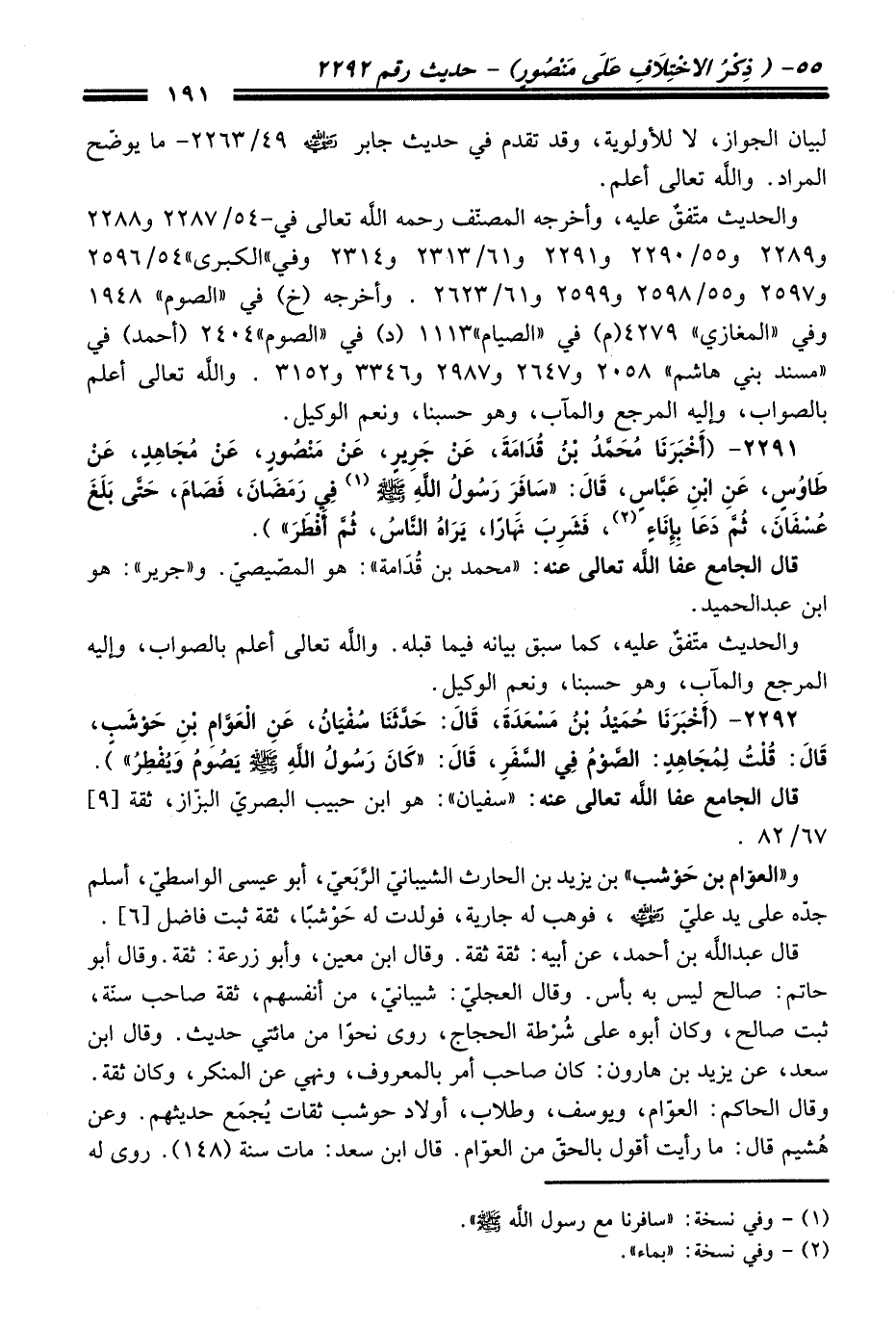 2292 - (أَخْبَرَنَا حُمَيْدُ بْنُ مَسْعَدَةَ, قَالَ: حَدَّثَنَا سُفْيَانُ, عَنِ الْعَوَّامِ بْنِ حَوْشَبٍ, قَالَ: قُلْتُ لِمُجَاهِدٍ: الصَّوْمُ فِي السَّفَرِ, قَالَ: "كَانَ رَسُولُ اللَّهِ - صلى اللَّه عليه وسلم - يَصُومُ وَيُفْطِرُ").