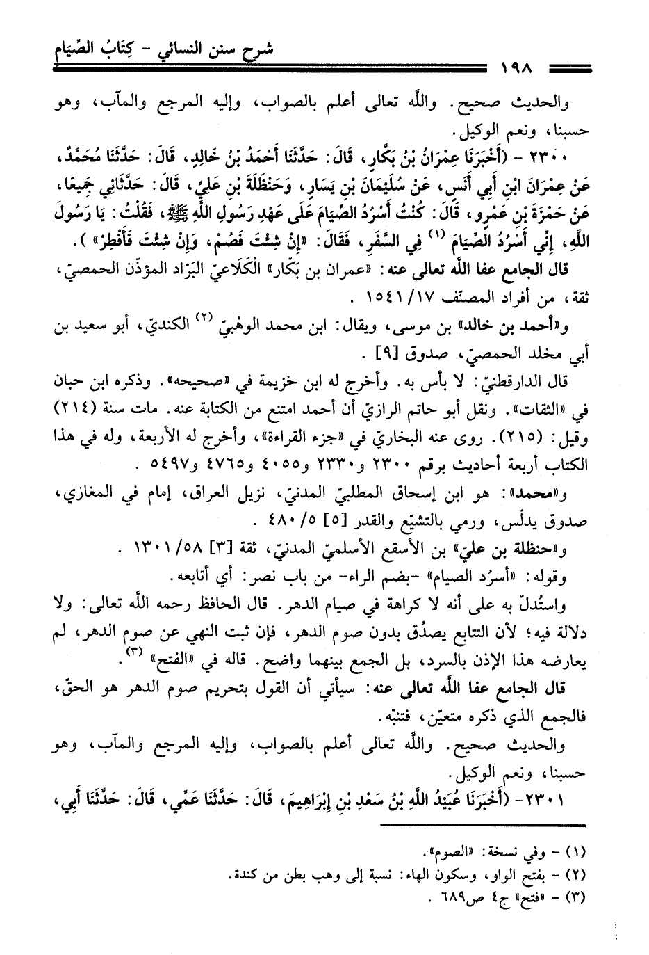 2300 - (أَخْبَرَنَا عِمْرَانُ بْنُ بَكَّارٍ, قَالَ: حَدَّثَنَا أَحْمَدُ بْنُ خَالِدٍ, قَالَ: حَدَّثَنَا مُحَمَّدٌ, عَنْ عِمْرَانَ بْنِ أَبِي أَنَسٍ, عَنْ سُلَيْمَانَ بْنِ يَسَارٍ, وَحَنْظَلَةَ بْنِ عَلِيٍّ, قَالَ: حَدَّثَانِي جَمِيعًا, عَنْ حَمْزَةَ بْنِ عَمْرٍو, قَالَ: كُنْتُ أَسْرُدُ الصِّيَامَ عَلَى عَهْدِ رَسُولِ اللَّهِ - صلى اللَّه عليه وسلم -, فَقُلْتُ: يَا رَسُولَ اللَّهِ, إِنِّي أَسْرُدُ الصِّيَامَ (¬1) فِي السَّفَرِ, فَقَالَ: «إِنْ شِئْتَ فَصُمْ, وَإِنْ شِئْتَ فَأَفْطِرْ»).