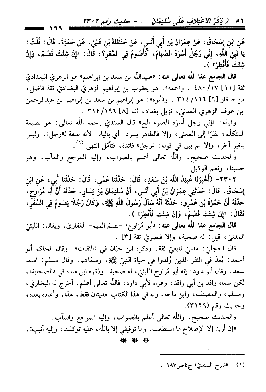 2302 - (أَخْبَرَنَا عُبَيْدُ اللَّهِ بْنُ سَعْدٍ, قَالَ: حَدَّثَنَا عَمِّي, قَالَ: حَدَّثَنَا أَبِي, عَنِ ابْنِ إِسْحَاقَ, قَالَ: حَدَّثَنِي عِمْرَانُ بْنُ أَبِي أَنَسٍ, أَنَّ سُلَيْمَانَ بْنَ يَسَارٍ, حَدَّثَهُ أَنَّ أَبَا مُرَاوِحٍ, حَدَّثَهُ أَنَّ حَمْزَةَ بْنَ عَمْرٍو, حَدَّثَهُ أَنَّهُ سَأَلَ رَسُولَ اللَّهِ - صلى اللَّه عليه وسلم -, وَكَانَ رَجُلاً يَصُومُ فِي السَّفَرِ, فَقَالَ: «إِنْ شِئْتَ فَصُمْ, وَإِنْ شِئْتَ فَأَفْطِرْ»).