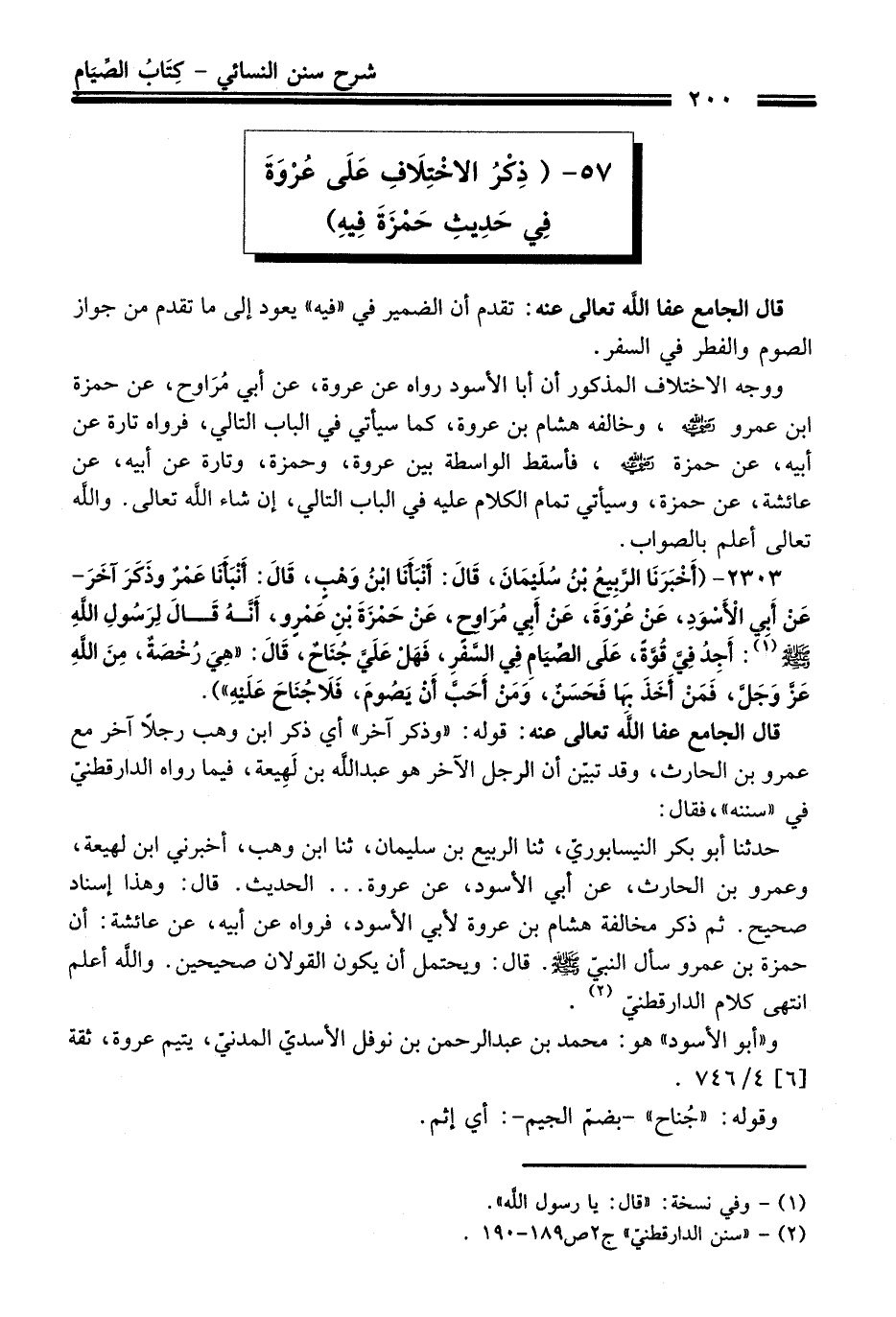 حدثنا أبو بكر النيسابوريّ، ثنا الربيع بن سليمان، ثنا ابن وهب، أخبرني ابن لهيعة، وعمرو بن الحارث، عن أبي الأسود، عن عروة ... الحديث. قال: وهذا إسناد صحيح. ثم ذكر مخالفة هشام بن عروة لأبي الأسود، فرواه عن أبيه، عن عائشة: أن حمزة بن عمرو سأل النبيّ - صلى اللَّه عليه وسلم -. قال: ويحتمل أن يكون القولان صحيحين. واللَّه أعلم انتهى كلام الدارقطنيّ (¬2).