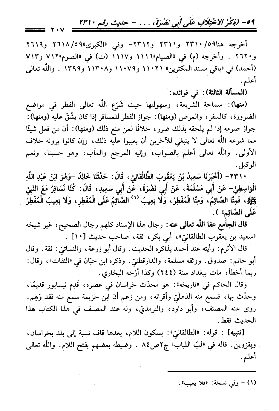 2310 - (أَخْبَرَنَا سَعِيدُ بْنُ يَعْقُوبَ الطَّالْقَانِيُّ, قَالَ: حَدَّثَنَا خَالِدٌ -وَهُوَ ابْنُ عَبْدِ اللَّهِ الْوَاسِطِيُّ- عَنْ أَبِي مَسْلَمَةَ, عَنْ أَبِي نَضْرَةَ, عَنْ أَبِي سَعِيدٍ, قَالَ: كُنَّا نُسَافِرُ مَعَ رَسُولِ اللَّهِ - صلى اللَّه عليه وسلم -, فَمِنَّا الصَّائِمُ, وَمِنَّا الْمُفْطِرُ, وَلاَ يَعِيبُ (¬1) الصَّائِمُ عَلَى الْمُفْطِرِ, وَلاَ يَعِيبُ الْمُفْطِرُ عَلَى الصَّائِمِ).