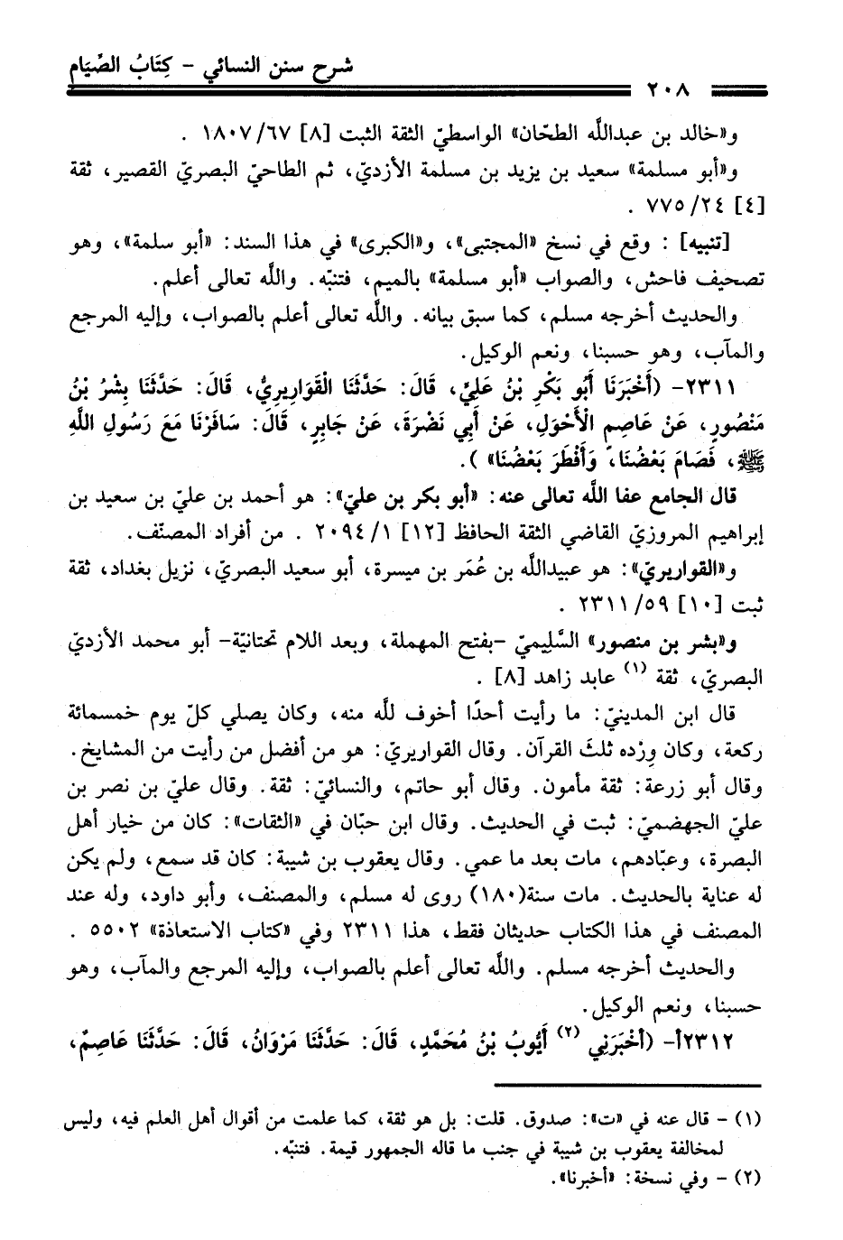 2311 - (أَخْبَرَنَا أَبُو بَكْرِ بْنُ عَلِيٍّ, قَالَ: حَدَّثَنَا الْقَوَارِيرِيُّ, قَالَ: حَدَّثَنَا بِشْرُ بْنُ مَنْصُورٍ, عَنْ عَاصِمٍ الأَحْوَلِ, عَنْ أَبِي نَضْرَةَ, عَنْ جَابِرٍ, قَالَ: سَافَرْنَا مَعَ رَسُولِ اللَّهِ - صلى اللَّه عليه وسلم -, فَصَامَ بَعْضُنَا, وَأَفْطَرَ بَعْضُنَا).