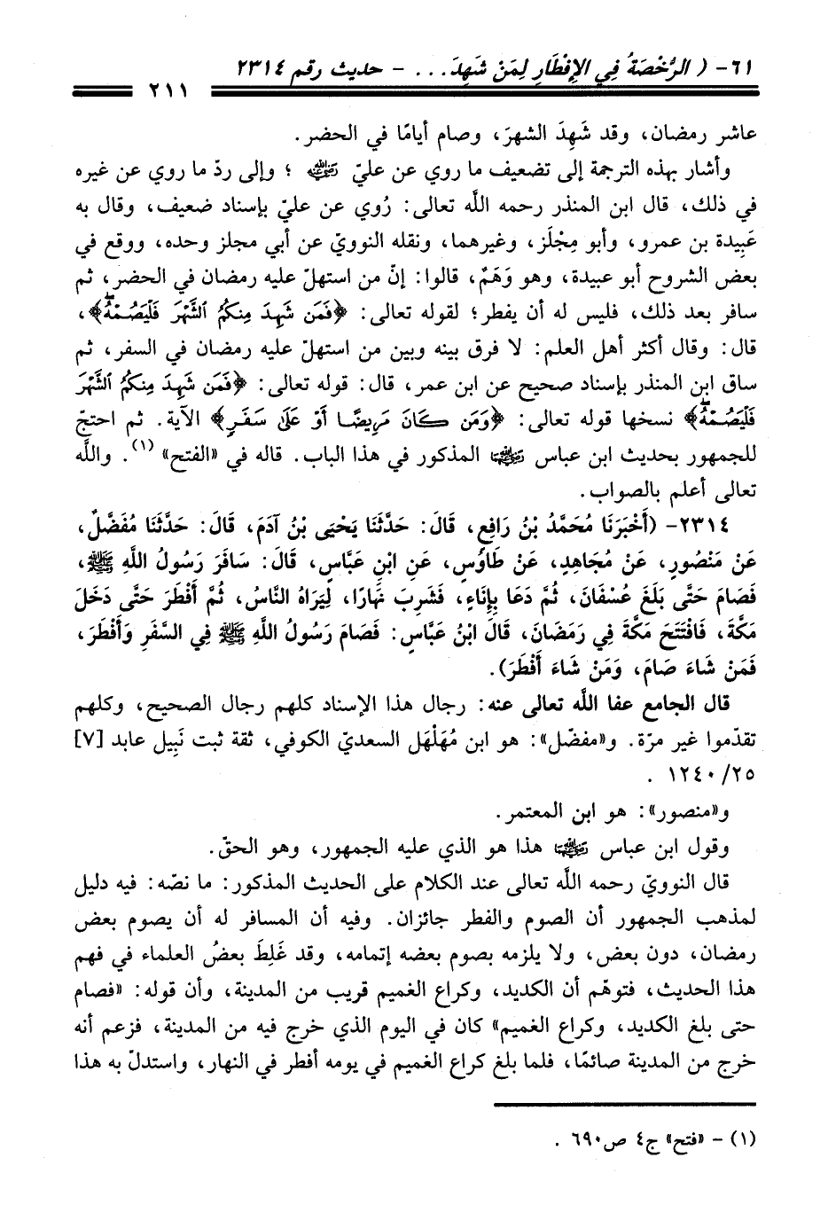 وأشار بهذه الترجمة إلى تضعيف ما روي عن عليّ - رضي اللَّه عنه -؛ وإلى ردّ ما روي عن غيره في ذلك، قال ابن المنذر -رحمه اللَّه تعالى-: رُوي عن عليّ بإسناد ضعيف، وقال به عَبِيدة بن عمرو، وأبو مِجْلَز، وغيرهما، ونقله النوويّ عن أبي مجلز وحده، ووقع في بعض الشروح أبو عبيدة، وهو وَهَمٌ، قالوا: إنّ من استهلّ عليه رمضان في الحضر ثم سافر بعد ذلك، فليس له أن يفطر؛ لقوله تعالى: {فَمَنْ شَهِدَ مِنْكُمُ الشَّهْرَ فَلْيَصُمْهُ}، قال: وقال أكثر أهل العلم: لا فرق بينه وبين من استهلّ عليه رمضان في السفر، ثم ساق ابن المنذر بإسناد صحيح عن ابن عمر، قال: قوله تعالى: {فَمَنْ شَهِدَ مِنْكُمُ الشَّهْرَ فَلْيَصُمْهُ} نسخها قوله تعالى: {وَمَنْ كَانَ مَرِيضًا أَوْ عَلَى سَفَرٍ} الآية. ثم احتجّ للجمهور بحديث ابن عباس - رضي اللَّه عنهما - المذكور في هذا الباب. قاله في "الفتح" (¬1). واللَّه تعالى أعلم بالصواب.