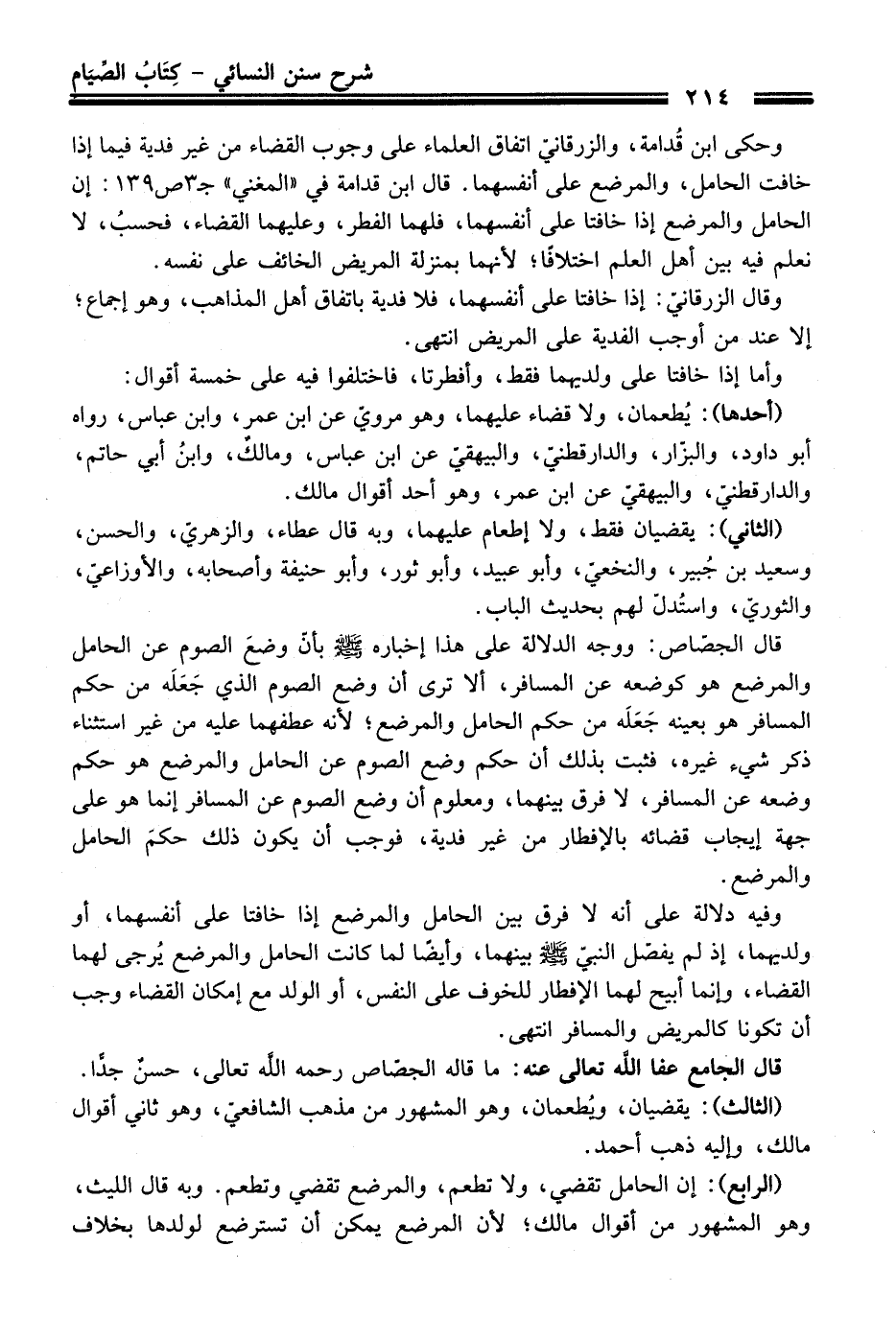 قال الجصّاص: ووجه الدلالة على هذا إخباره - صلى اللَّه عليه وسلم - بأنّ وضعَ الصوم عن الحامل والمرضع هو كوضعه عن المسافر، ألا ترى أن وضع الصوم الذي جَعَلَه من حكم المسافر هو بعينه جَعَلَه من حكم الحامل والمرضع؛ لأنه عطفهما عليه من غير استثناء ذكر شيء غيره، فثبت بذلك أن حكم وضع الصوم عن الحامل والمرضع هو حكم وضعه عن المسافر، لا فرق بينهما، ومعلوم أن وضع الصوم عن المسافر إنما هو على جهة إيجاب قضائه بالإفطار من غير فدية، فوجب أن يكون ذلك حكمَ الحامل والمرضع.