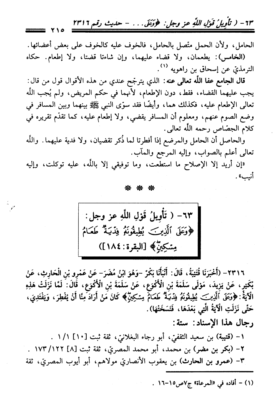 63 - (تَأْوِيلُ قَوْلِ اللَّه -عَزَّ وَجَلَّ-: {وَعَلَى الَّذِينَ يُطِيقُونَهُ فِدْيَةٌ طَعَامُ مِسْكِينٍ} [البقرة: 184])