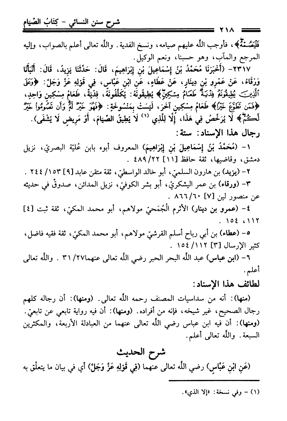 2317 - (أَخْبَرَنَا مُحَمَّدُ بْنُ إِسْمَاعِيلَ بْنِ إِبْرَاهِيمَ, قَالَ: حَدَّثَنَا يَزِيدُ, قَالَ: أَنْبَأَنَا وَرْقَاءُ, عَنْ عَمْرِو بْنِ دِينَارٍ, عَنْ عَطَاءٍ, عَنِ ابْنِ عَبَّاسٍ, فِي قَوْلِهِ -عَزَّ وَجَلَّ-: {وَعَلَى الَّذِينَ يُطِيقُونَهُ فِدْيَةٌ طَعَامُ مِسْكِينٍ} يُطِيقُونَهُ: يُكَلَّفُونَهُ, فِدْيَةٌ, طَعَامُ مِسْكِينٍ وَاحِدٍ, {فَمَنْ تَطَوَّعَ خَيْرًا} طَعَامُ مِسْكِينٍ آخَرَ, لَيْسَتْ بِمَنْسُوخَةٍ: {فَهُوَ خَيْرٌ لَهُ وَأَنْ تَصُومُوا خَيْرٌ لَكُمْ} لاَ يُرَخَّصُ فِي هَذَا, إِلاَّ لِلَّذِي (¬1) لاَ يُطِيقُ الصِّيَامَ, أَوْ مَرِيضٍ لاَ يُشْفَى).