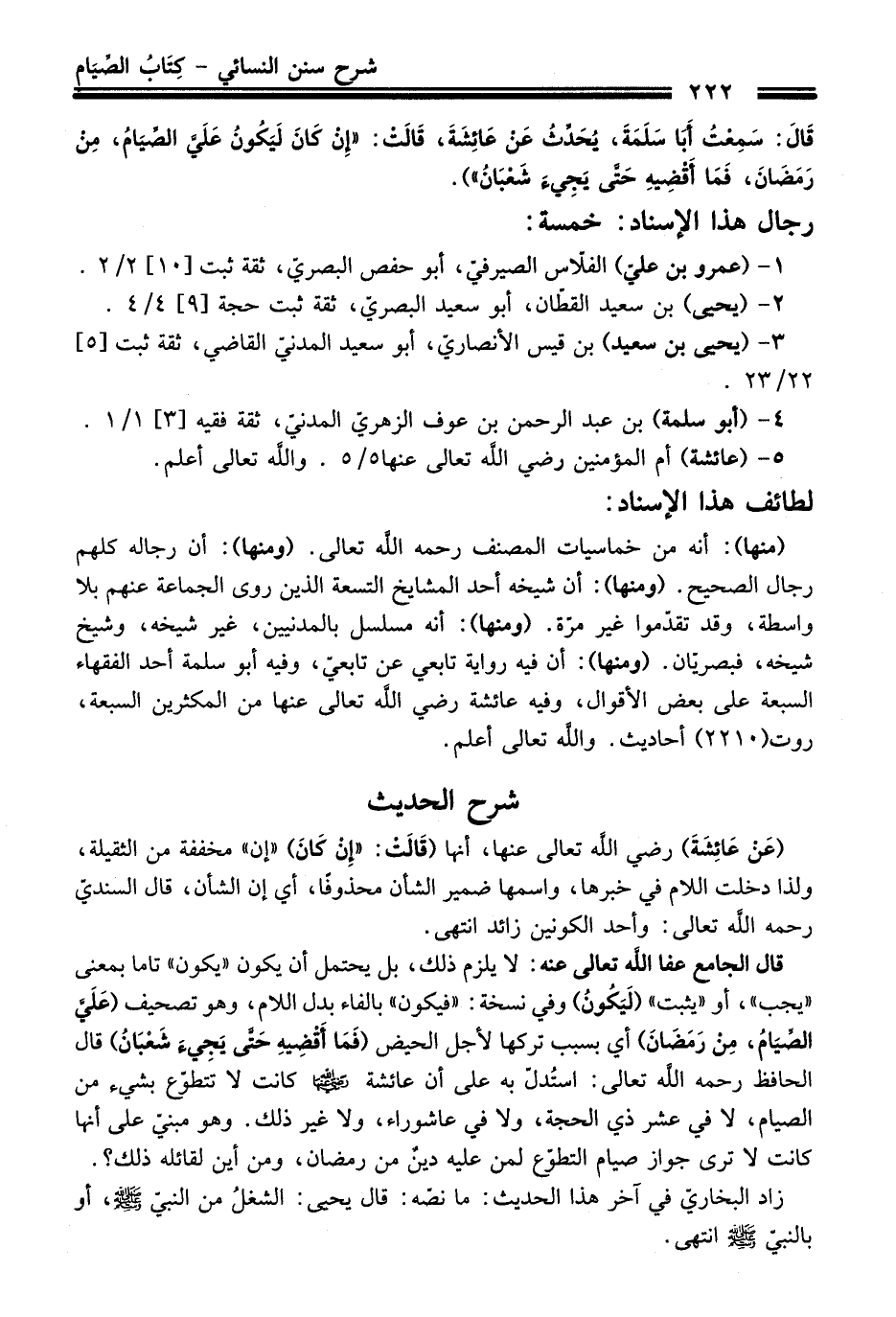 قال الجامع - عفا اللَّه تعالى عنه -: لا يلزم ذلك، بل يحتمل أن يكون "يكون" تاما بمعنى "يجب"، أو"يثبت" (لَيَكُونُ) وفي نسخة: "فيكون" بالفاء بدل اللام، وهو تصحيف (عَلَيَّ الصِّيَامُ، مِنْ رَمَضَانَ) أي بسبب تركها لأجل الحيض (فَمَا أَقْضِيهِ حَتَّى يَجِيءَ شَعْبَانُ) قال الحافظ -رحمه اللَّه تعالى-: استُدلّ به على أن عائشة - رضي اللَّه عنها -كانت لا تتطوّع بشيء من الصيام، لا في عشر ذي الحجة، ولا في عاشوراء، ولا غير ذلك. وهو مبنيّ على أنها كانت لا ترى جواز صيام التطوّع لمن عليه دينٌ من رمضان، ومن أين لقائله ذلك؟.