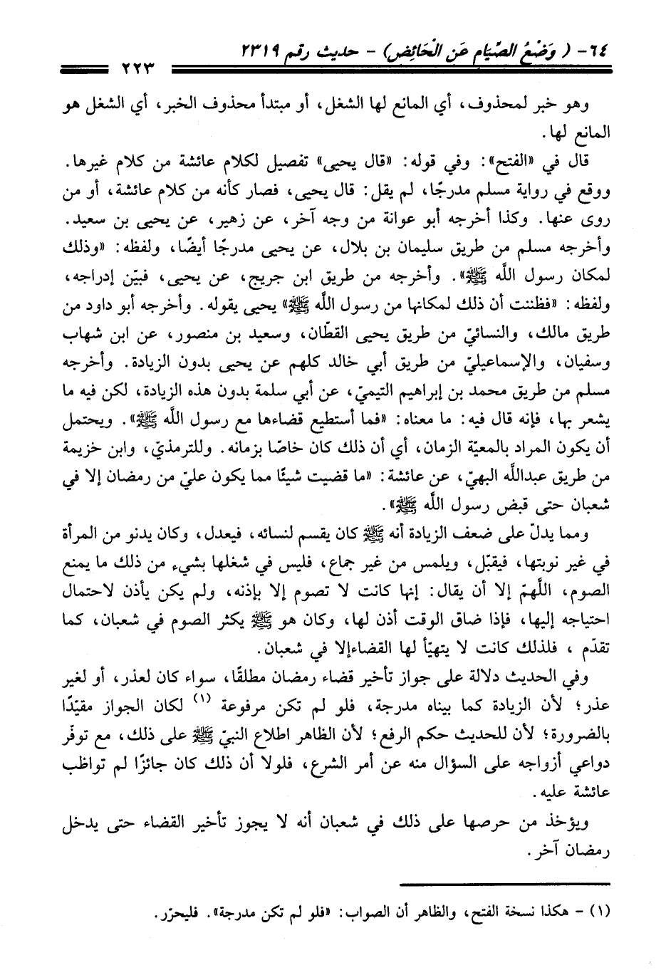 وأخرجه مسلم من طريق سليمان بن بلال، عن يحيى مدرجًا أيضًا، ولفظه: "وذلك لمكان رسول اللَّه - صلى اللَّه عليه وسلم -". وأخرجه من طريق ابن جريج، عن يحيي، فبين إدراجه، ولفظه: "فظننت أن ذلك لمكانها من رسول اللَّه - صلى اللَّه عليه وسلم -" يحيى يقوله. وأخرجه أبو داود من طريق مالك، والنسائيّ من طريق يحيي القطّان، وسعيد بن منصور، عن ابن شهاب وسفيان، والإسماعيليّ من طريق أبي خالد كلهم عن يحيي بدون الزيادة. وأخرجه مسلم من طريق محمد بن إبراهيم التيميّ، عن أبي سلمة بدون هذه الزيادة، لكن فيه ما يشعر بها، فإنه قال فيه: ما معناه: "فما أستطيع قضاءها مع رسول اللَّه - صلى اللَّه عليه وسلم - ". ويحتمل أن يكون المراد بالمعيّة الزمان، أي أن ذلك كان خاصًا بزمانه. وللترمذيّ، وابن خزيمة من طريق عبد اللَّه البهيّ، عن عائشة: "ما قضيت شيئًا مما يكون عليّ من رمضان إلا في شعبان حتى قبض رسول اللَّه - صلى اللَّه عليه وسلم - ".