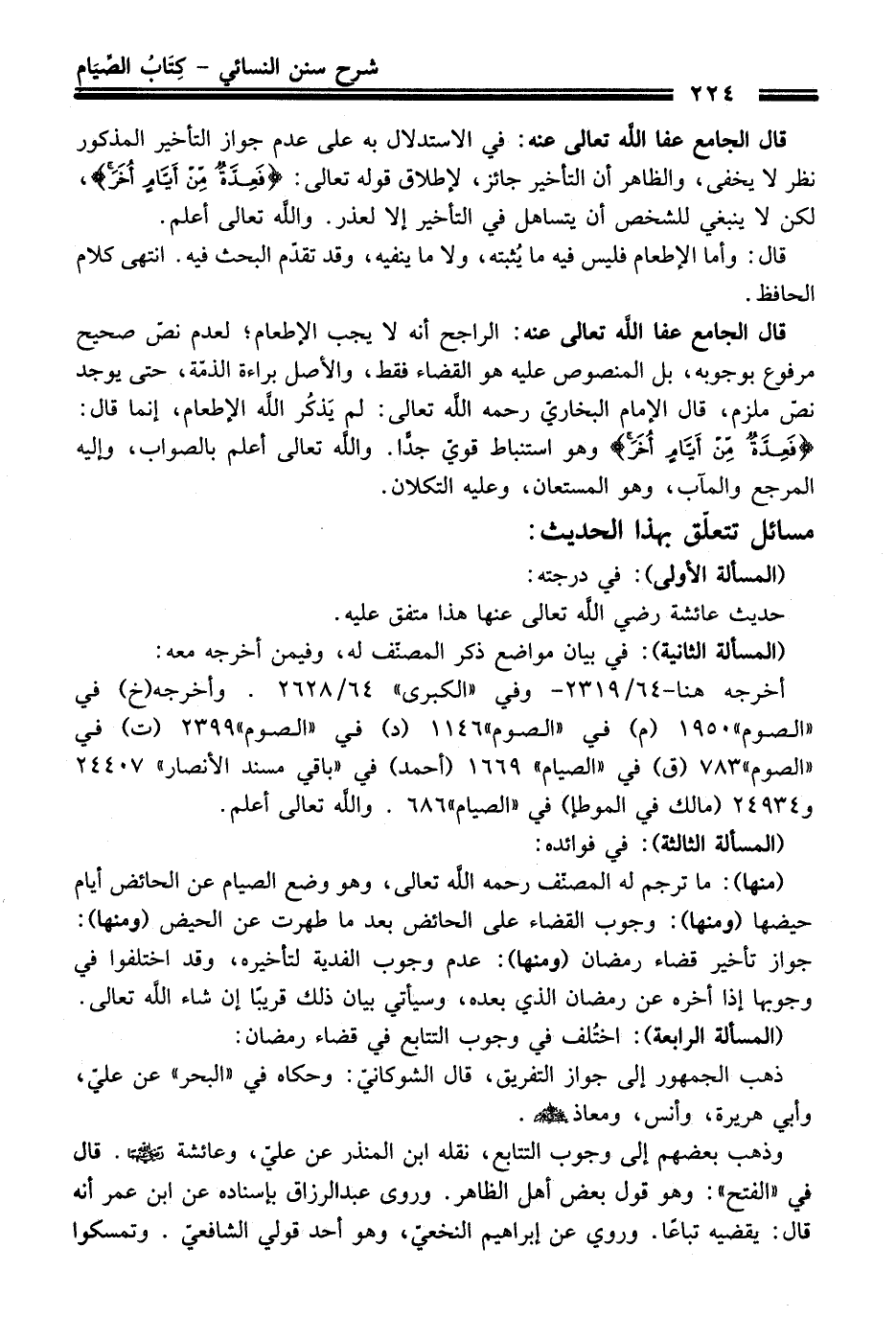 (منها): ما ترجم له المصنّف -رحمه اللَّه تعالى-، وهو وضع الصيام عن الحائض أيام حيضها (ومنها): وجوب القضاء على الحائض بعد ما طهرت عن الحيض (ومنها): جواز تأخير قضاء رمضان (ومنها): عدم وجوب الفدية لتاخيره، وقد اختلفوا في وجوبها إذا آخره عن رمضان الذي بعده، وسيأتى بيان ذلك قريبًا إن شاء اللَّه تعالى.