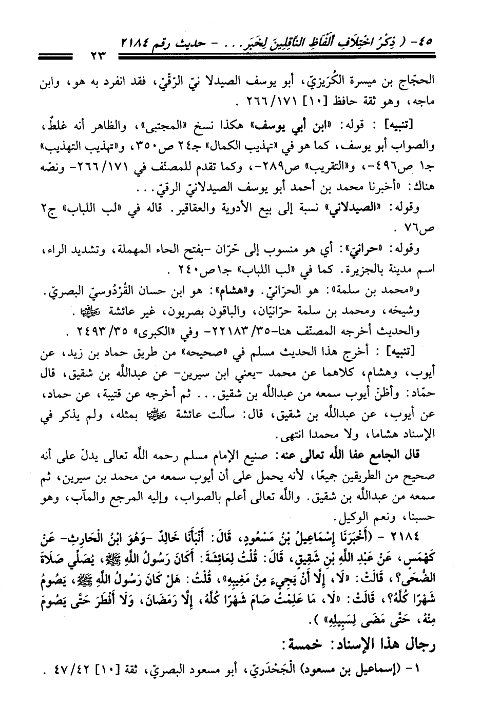 [تنبيه]: أخرج هذا الحديث مسلم في "صحيحه" من طريق حماد بن زيد، عن أيوب، وهشام، كلاهما عن محمد -يعني ابن سيرين- عن عبد اللَّه بن شقيق، قال حمّاد: وأظن أيوب سمعه من عبد اللَّه بن شقيق ... ثم أخرجه عن قتيبة، عن حماد، عن أيوب، عن عبد اللَّه بن شقيق، قال: سألت عائشة - رضي اللَّه عنها - بمثله، ولم يذكر في الإسناد هشاما، ولا محمدا انتهى.