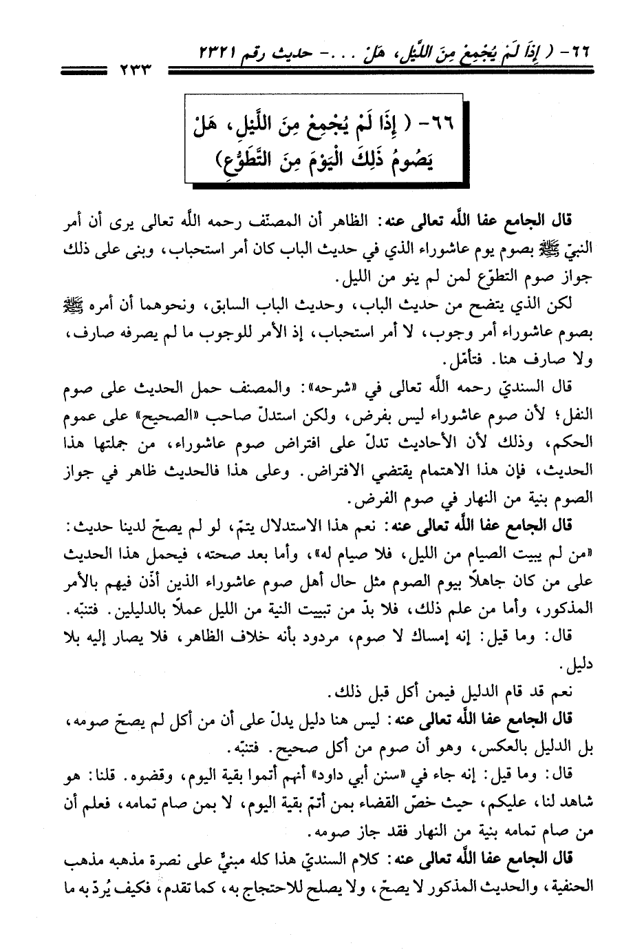 قال الجامع - عفا اللَّه تعالى عنه -: نعم هذا الاستدلال يتمّ، لو لم يصحّ لدينا حديث: "من لم يبيت الصيام من الليل، فلا صيام له"، وأما بعد صحته، فيحمل هذا الحديث على من كان جاهلاً بيوم الصوم مثل حال أهل صوم عاشوراء الذين أذّن فيهم بالأمر المذكور، وأما من علم ذلك، فلا بدّ من تبييت النية من الليل عملاً بالدليلين. فتنبّه.