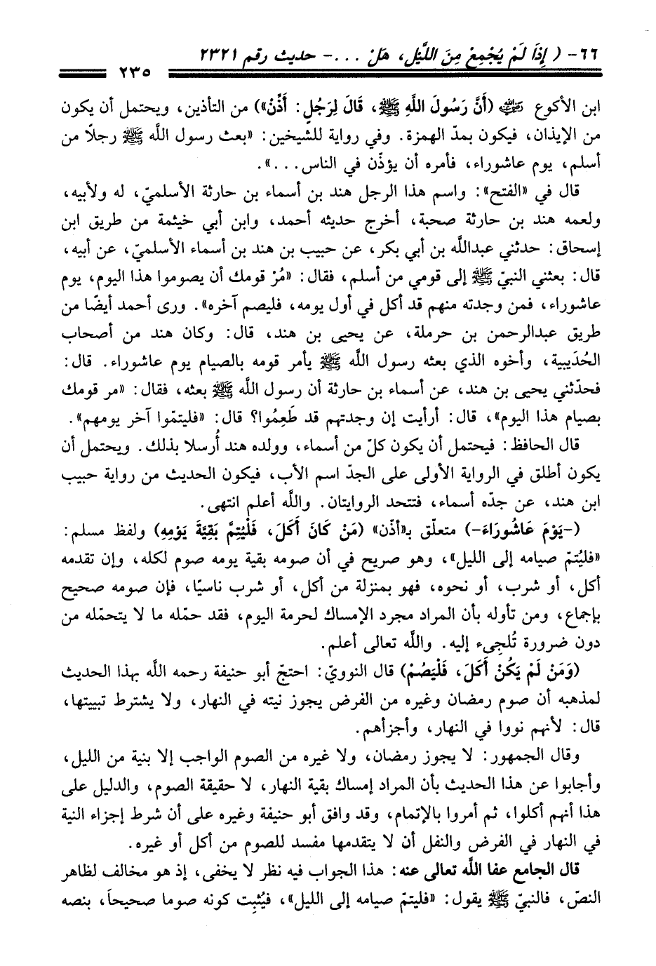 (وَمَنْ لَمْ يَكُنْ أَكَلَ، فَليَصُمْ) قال النوويّ: احتجّ أبو حنيفة -رَحِمَهُ اللَّهُ- بهذا الحديث لمذهبه أن صوم رمضان وغيره من الفرض يجوز نيته في النهار، ولا يشترط تبييتها، قال: لأنهم نووا في النهار، وأجزأهم.