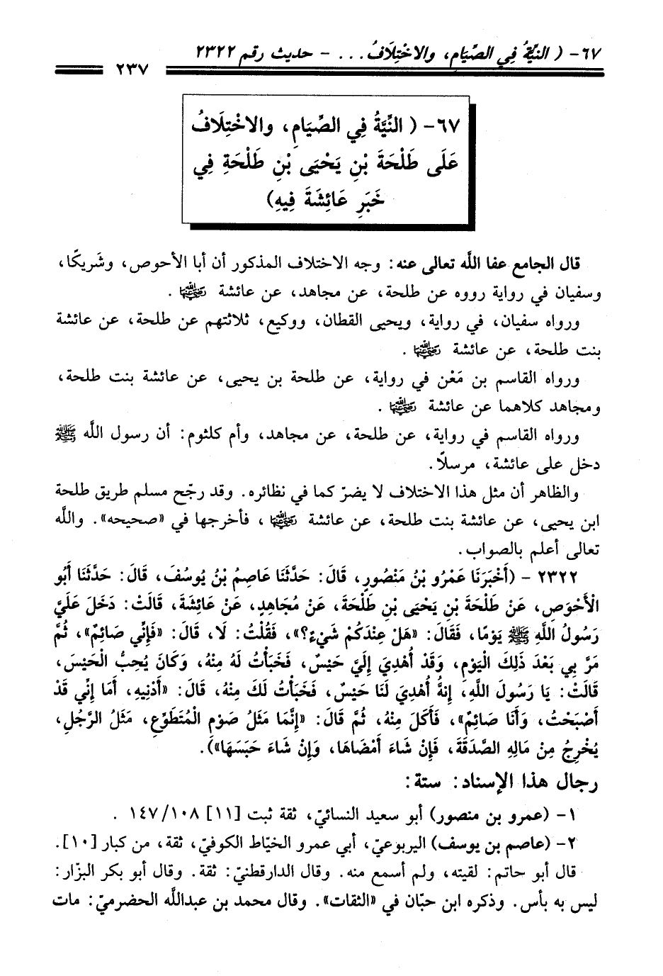 67 - (النِّيَّةُ فِي الصِّيَامِ، والاخْتِلَافُ عَلَى طَلْحَةَ بْنِ يَحيىَ بْنِ طَلْحَةِ فِي خَبَرِ عَائِشَةَ فِيهِ)