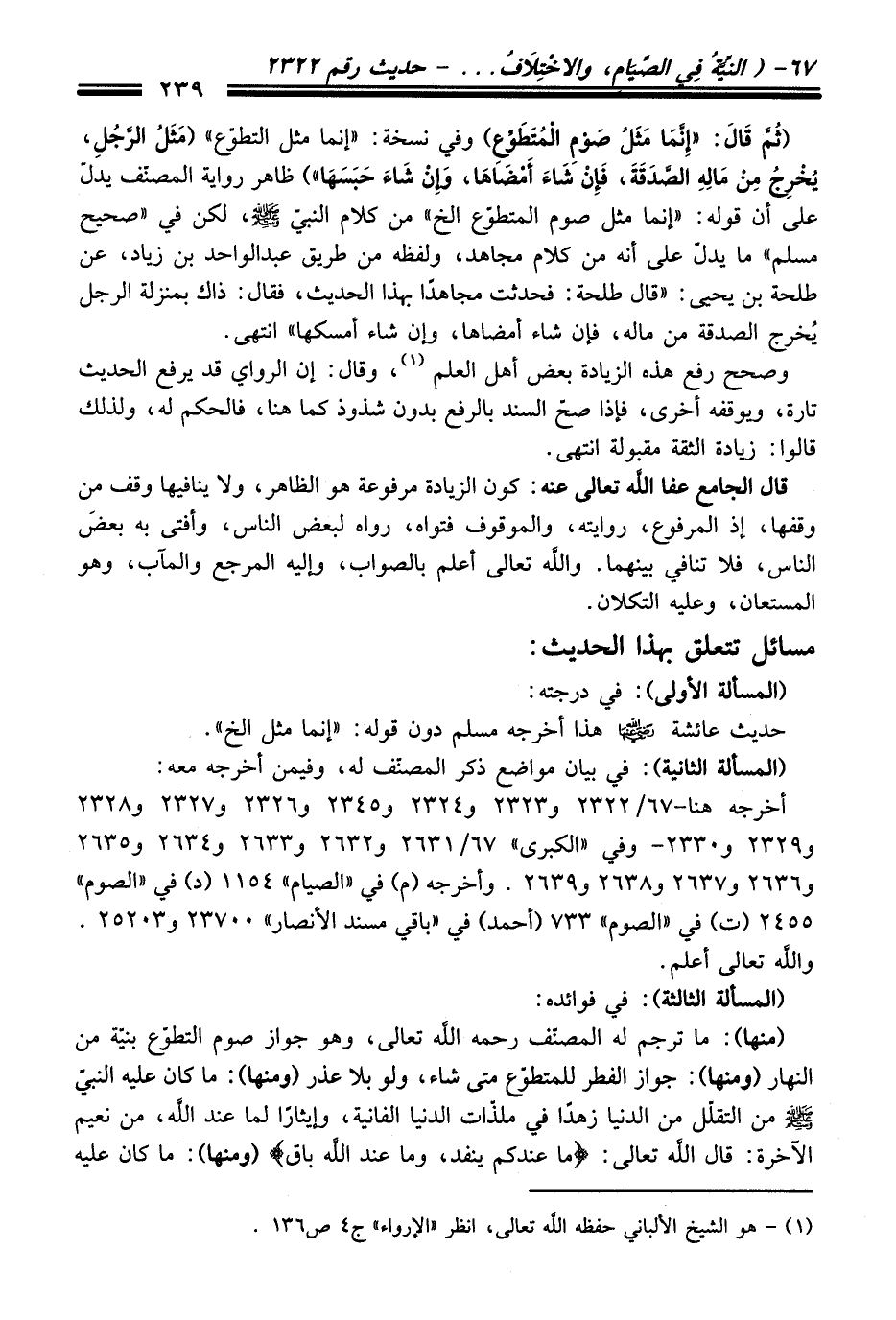 قال الجامع - عفا اللَّه تعالى عنه -: كون الزيادة مرفوعة هو الظاهر، ولا ينافيها وقف من وقفها، إذ المرفوع، روايته، والموقوف فتواه، رواه لبعض الناس، وأفتى به بعضَ الناس، فلا تنافي بينهما. واللَّه تعالى أعلم بالصواب، وإليه المرجع والمآب، وهو المستعان، وعليه التكلان.
