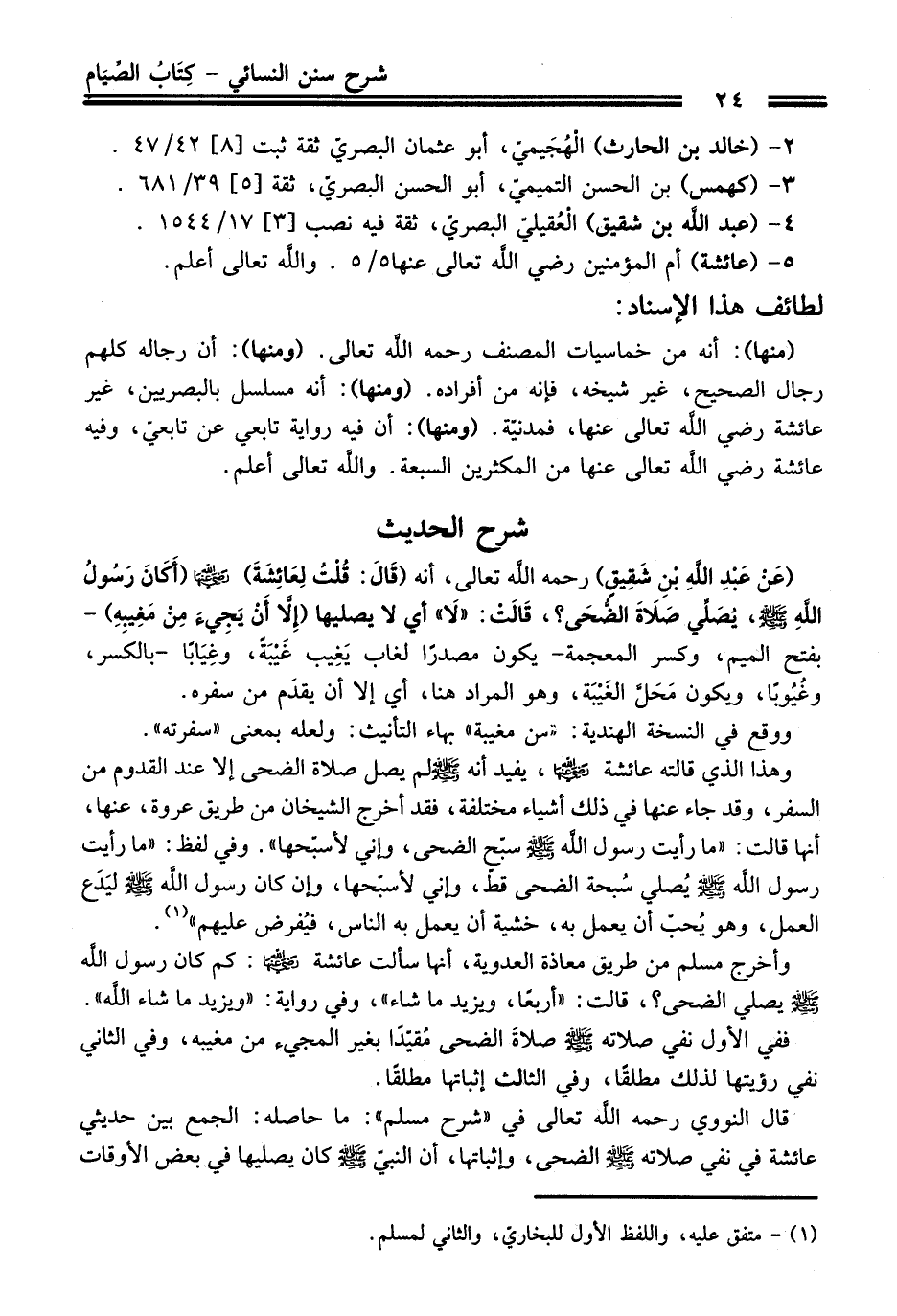 (عَنْ عَبْدِ اللَّهِ بْنِ شَقِيقٍ) -رحمه اللَّه تعالى-، أنه (قَالَ: قُلْتُ لِعَائِشَةَ) - رضي اللَّه عنها - (أَكَانَ رَسُولُ اللَّهِ - صلى اللَّه عليه وسلم -، يُصَلِّي صَلَاةَ الضُّحَى؟، قَالَتْ: "لَا" أي لا يصليها (إِلاَّ أَنْ يَجِيءَ مِنْ مَغِيبِهِ) - بفتح الميم، وكسر المعجمة- يكون مصدرًا لغاب يَغِيب غَيْبَةً، وغِيَابًا -بالكسر، وغُيُوباً، ويكون مَحَلَّ الغَيْبَة، وهو المراد هنا، أي إلا أن يقدَم من سفره.
