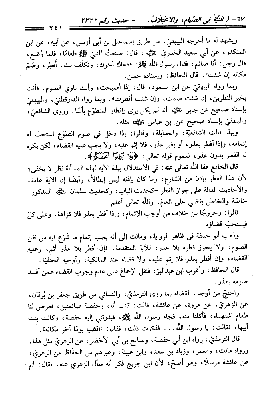 قال الجامع - عفا اللَّه تعالى عنه -: في الاستدلال بهذه الآية لهذه المسألة نظر لا يخفى؛ لأن هذا الفطر بإذن من الشارع، وما كان بإذنه ليس إبطالاً، وأيضًا إن الآية عامة، والأحاديث الدالة على جواز الفطر -كحديث الباب، وكحديث سلمان - رضي اللَّه عنه - المذكور- خاصة والخاصّ يقضي على العامّ. واللَّه تعالى أعلم.