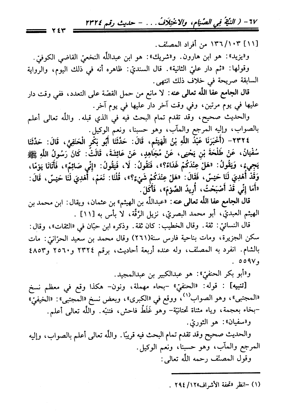 [تنبيه]: قوله: "الحنفيّ"- بحاء مهملة، ونون- هكذا وقع في معظم نسخ "المجتبى"، وهو الصواب (¬1)، ووقع في "الكبرى"، وبعض نسخ "المجتبى": "الخيفيّ" -بخاء بعجمة، وياء مثناة تحتانيّة- وهو غَلَطٌ فاحش، فتنبّه. واللَّه تعالى أعلم.
