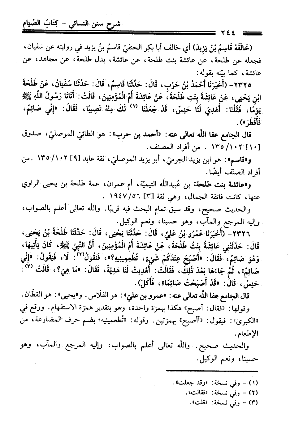 2325 - (أَخْبَرَنَا أَحْمَدُ بْنُ حَرْبٍ, قَالَ: حَدَّثَنَا قَاسِمٌ, قَالَ: حَدَّثَنَا سُفْيَانُ, عَنْ طَلْحَةَ بْنِ يَحْيَى, عَنْ عَائِشَةَ بِنْتِ طَلْحَةَ, عَنْ عَائِشَةَ أُمِّ الْمُؤْمِنِينَ, قَالَتْ: أَتَانَا رَسُولُ اللَّهِ - صلى اللَّه عليه وسلم - يَوْمًا, فَقُلْنَا أُهْدِيَ لَنَا حَيْسٌ, قَدْ جَعَلْنَا (¬1) لَكَ مِنْهُ نَصِيبًا, فَقَالَ: «إِنِّي صَائِمٌ, فَأَفْطَرَ»).