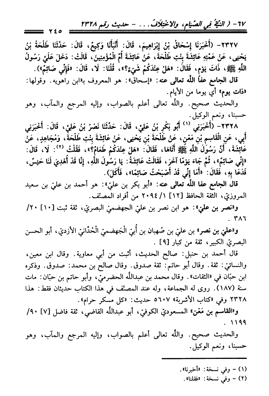 2327 - (أَخْبَرَنَا إِسْحَاقُ بْنُ إِبْرَاهِيمَ, قَالَ: أَنْبَأَنَا وَكِيعٌ, قَالَ: حَدَّثَنَا طَلْحَةُ بْنُ يَحْيَى, عَنْ عَمَّتِهِ عَائِشَةَ بِنْتِ طَلْحَةَ, عَنْ عَائِشَةَ أُمِّ الْمُؤْمِنِينَ, قَالَتْ: دَخَلَ عَلَيَّ رَسُولُ اللَّهِ - صلى اللَّه عليه وسلم -, ذَاتَ يَوْمٍ, فَقَالَ: «هَلْ عِنْدَكُمْ شَيْءٌ؟» , قُلْنَا: لاَ. قَالَ: «فَإِنِّي صَائِمٌ»).