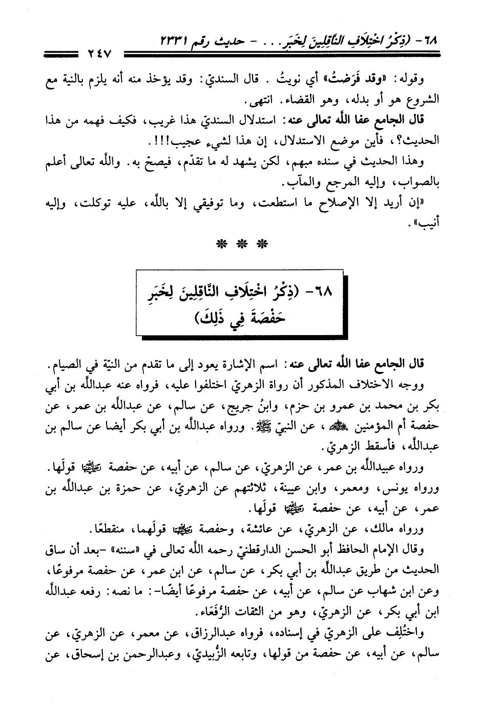 قال الجامع - عفا اللَّه تعالى عنه -: اسم الإشارة يعود إلى ما تقدم من النية في الصيام. ووجه الاختلاف المذكور أن رواة الزهريّ اختلفوا عليه، فرواه عنه عبد اللَّه بن أبي بكر بن محمد بن عمرو بن حزم، وابنُ جريج، عن سالم، عن عبد اللَّه بن عمر، عن حفصة أم المؤمنين - رضي اللَّه عنهم -، عن النبيّ - صلى اللَّه عليه وسلم -. ورواه عبد اللَّه بن أبي بكر أيضا عن سالم بن عبد اللَّه، فأسقط الزهريّ.