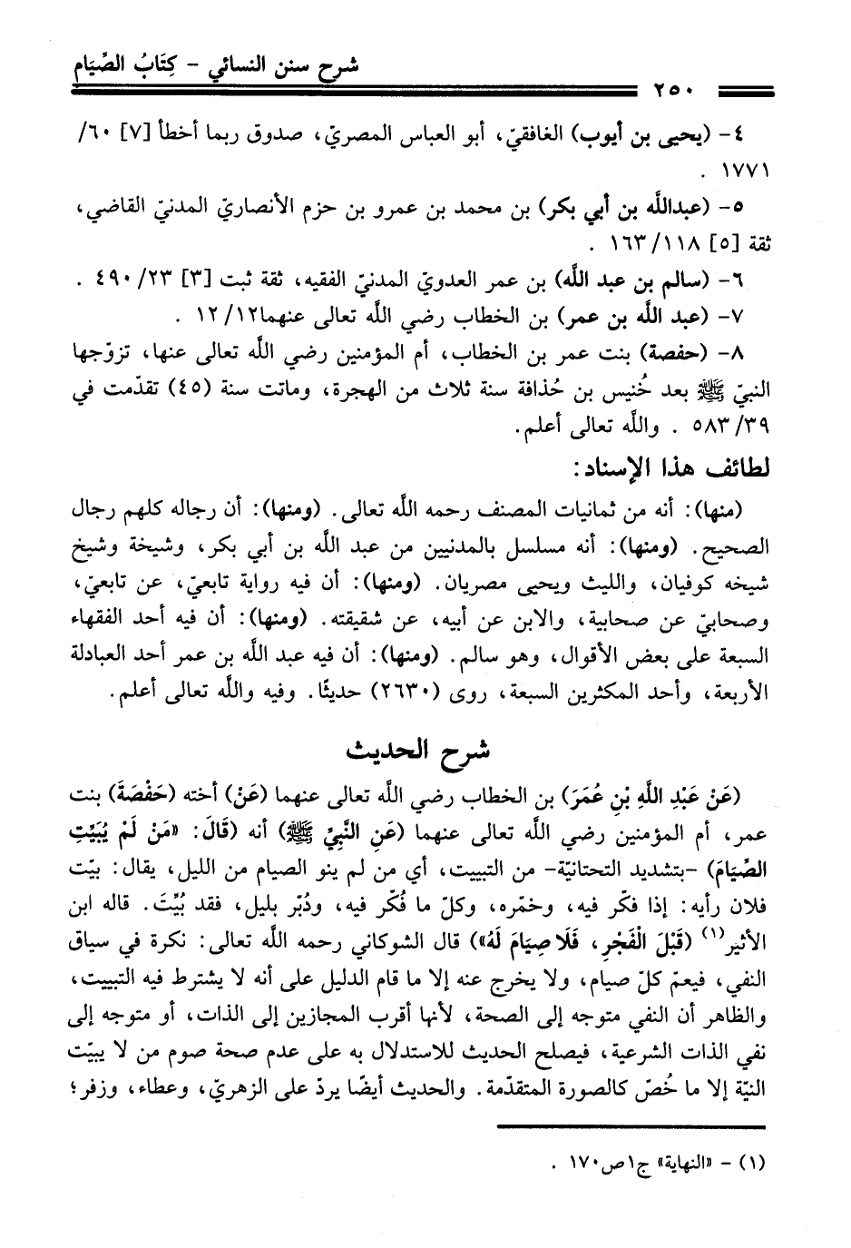 (عَنْ عَبدِ اللَّهِ بْنِ عُمَرَ) بن الخطاب - رضي اللَّه تعالى عنهما - (عَنْ) أخته (حَفْصَةَ) بنت عمر، أم المؤمنين - رضي اللَّه تعالى عنهما - (عَنِ النَّبِيِّ - صلى اللَّه عليه وسلم -) أنه (قَالَ: "مَنْ لَمْ يُبَيِّتِ الصِّيَامَ) -بتشديد التحتانيّة- من التبييت، أي من لم ينو الصيام من الليل، يقال: بيّت فلان رأيه: إذا فكّر فيه، وخمّره، وكلّ ما فُكّر فيه، ودُبْر بليل، فقد بُيِّتَ. قاله ابن الأثير (¬1) (قَبْلَ الْفَجْرِ، فَلَا صِيَامَ لَهُ") قال الشوكاني -رحمه اللَّه تعالى-: نكرة في سياق النفي، فيعمّ كلّ صيام، ولا يخرج عنه إلا ما قام الدليل على أنه لا يشترط فيه التبييت، والظاهر أن النفي متوجه إلى الصحة، لأنها أقرب المجازين إلى الذات، أو متوجه إلى نفي الذات الشرعية، فيصلح الحديث للاستدلال به على عدم صحة صوم من لا يبيّت النيّة إلا ما خُصّ كالصورة المتقدّمة. والحديث أيضًا يردّ على الزهريّ، وعطاء، وزفر؛