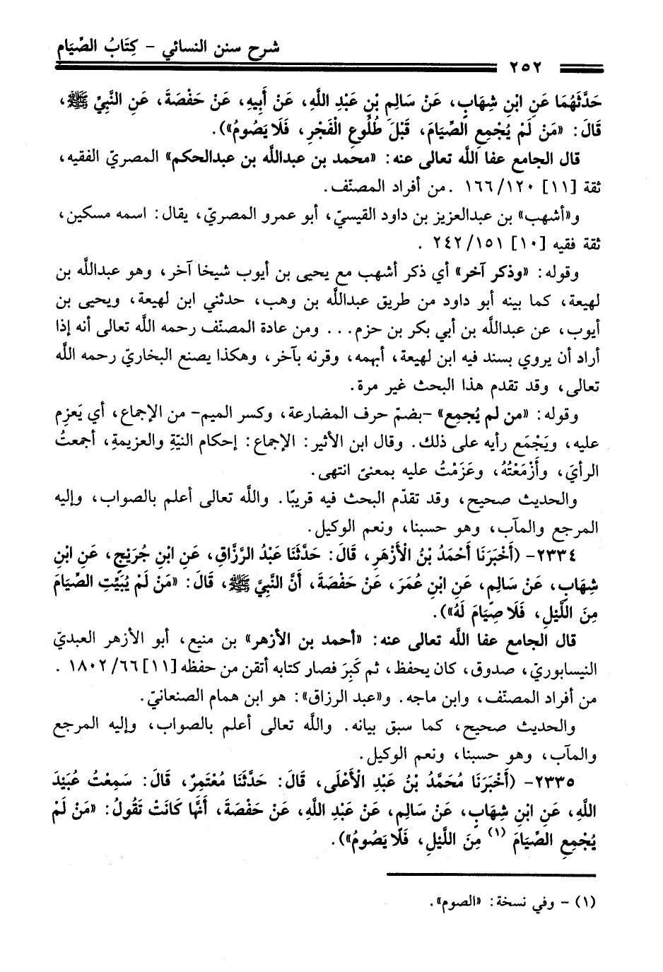 2334 - (أَخْبَرَنَا أَحْمَدُ بْنُ الأَزْهَرِ, قَالَ: حَدَّثَنَا عَبْدُ الرَّزَّاقِ, عَنِ ابْنِ جُرَيْجٍ, عَنِ ابْنِ شِهَابٍ,, عَنْ سَالِمٍ, عَنِ ابْنِ عُمَرَ, عَنْ حَفْصَةَ, أَنَّ النَّبِيَّ - صلى اللَّه عليه وسلم -, قَالَ: «مَنْ لَمْ يُبَيِّتِ الصِّيَامَ مِنَ اللَّيْلِ, فَلاَ صِيَامَ لَهُ»).