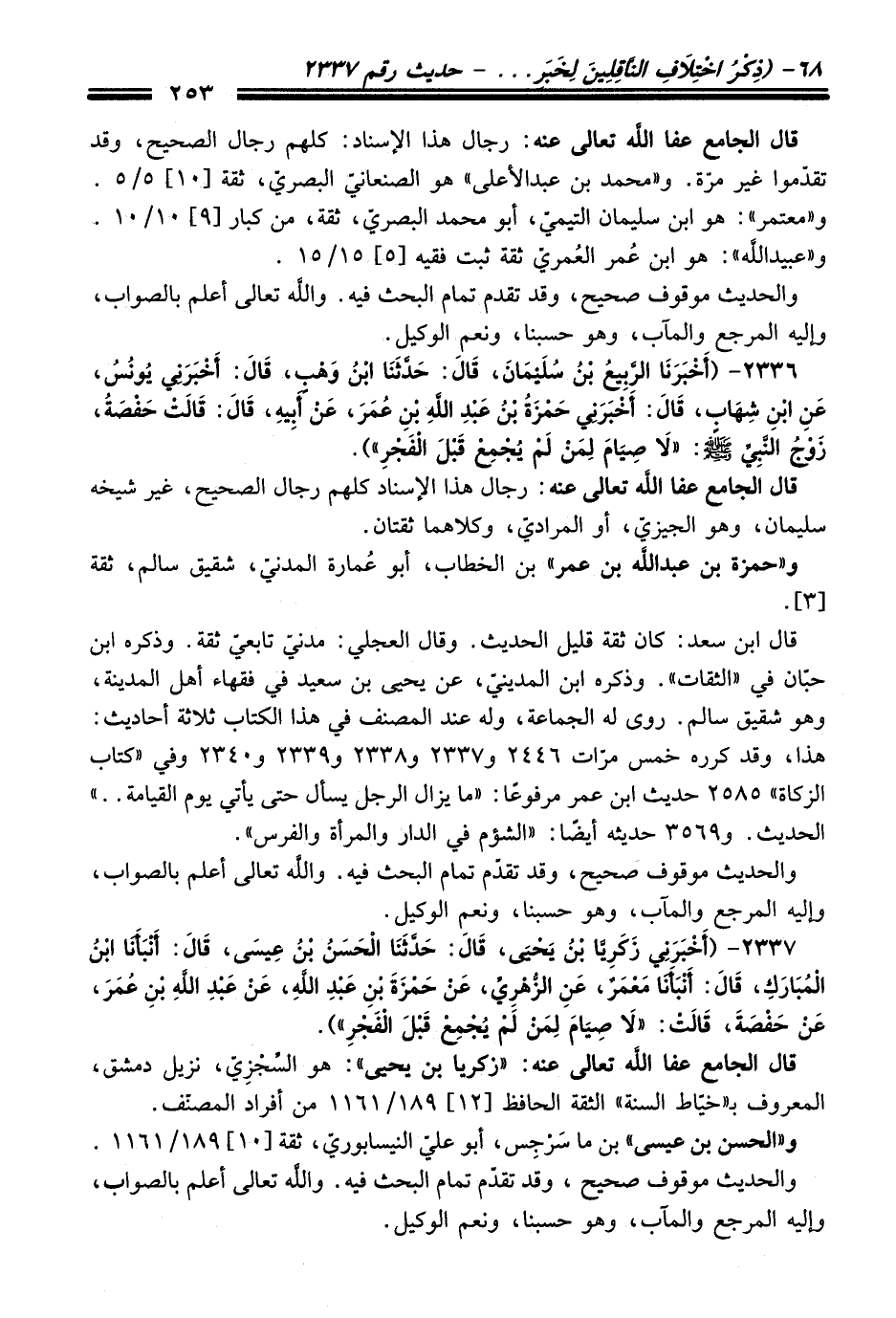 2337 - (أَخْبَرَنِي زَكَرِيَّا بْنُ يَحْيَى, قَالَ: حَدَّثَنَا الْحَسَنُ بْنُ عِيسَى, قَالَ: أَنْبَأَنَا ابْنُ الْمُبَارَكِ, قَالَ: أَنْبَأَنَا مَعْمَرٌ, عَنِ الزُّهْرِيِّ, عَنْ حَمْزَةَ بْنِ عَبْدِ اللَّهِ, عَنْ عَبْدِ اللَّهِ بْنِ عُمَرَ, عَنْ حَفْصَةَ, قَالَتْ: "لاَ صِيَامَ لِمَنْ لَمْ يُجْمِعْ قَبْلَ الْفَجْرِ").