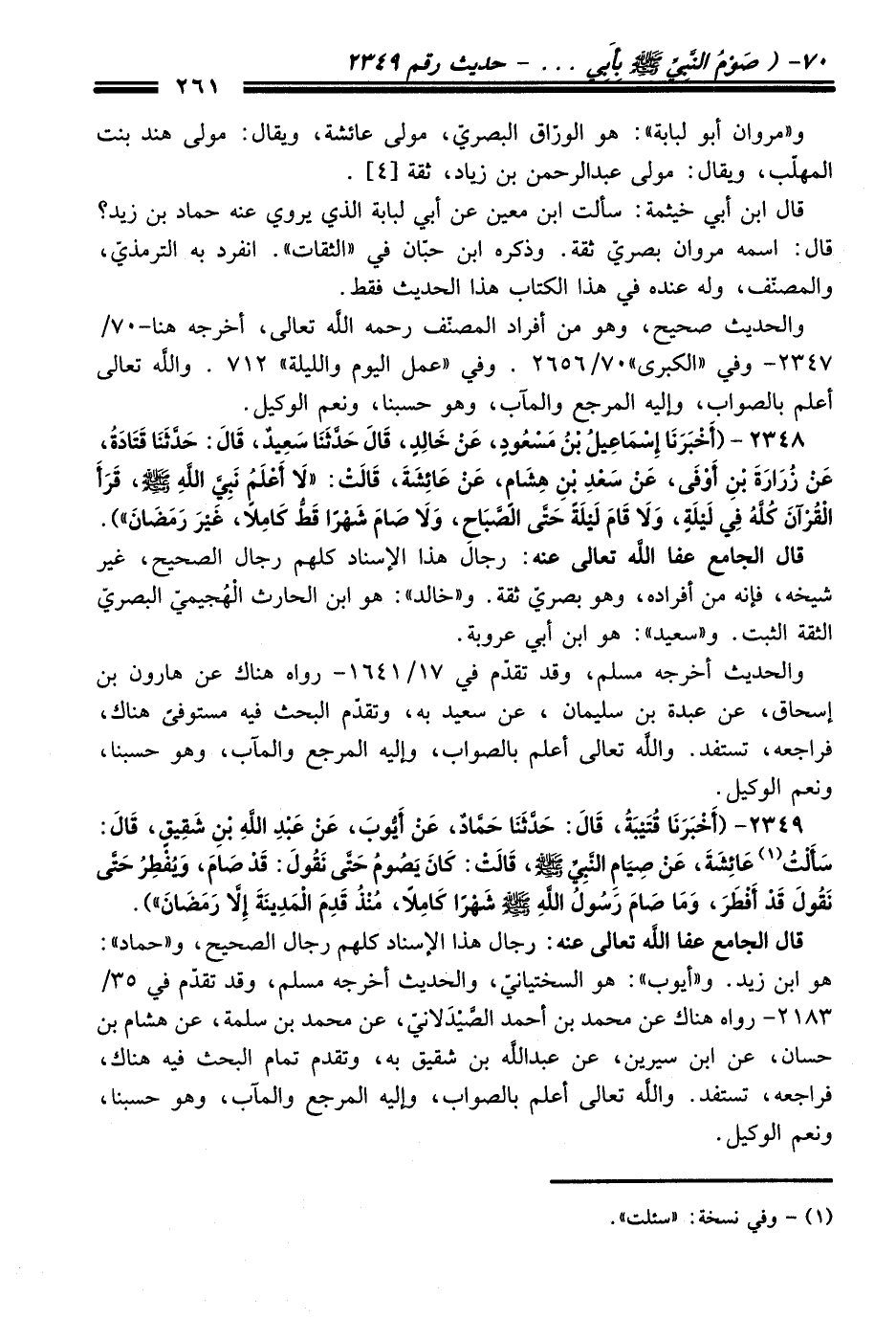 2349 - (أَخْبَرَنَا قُتَيْبَةُ, قَالَ: حَدَّثَنَا حَمَّادٌ, عَنْ أَيُّوبَ, عَنْ عَبْدِ اللَّهِ بْنِ شَقِيقٍ, قَالَ: سَأَلْتُ (¬1) عَائِشَةَ, عَنْ صِيَامِ النَّبِيِّ - صلى اللَّه عليه وسلم -, قَالَتْ: كَانَ يَصُومُ حَتَّى نَقُولَ: قَدْ صَامَ, وَيُفْطِرُ حَتَّى نَقُولَ قَدْ أَفْطَرَ, وَمَا صَامَ رَسُولُ اللَّهِ - صلى اللَّه عليه وسلم - شَهْرًا كَامِلاً, مُنْذُ قَدِمَ الْمَدِينَةَ إِلاَّ رَمَضَانَ).